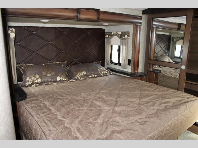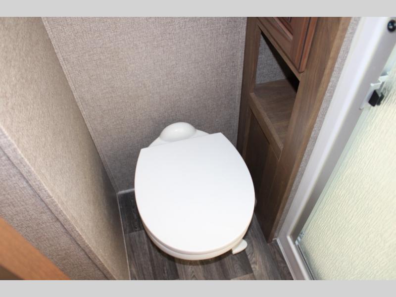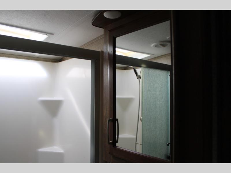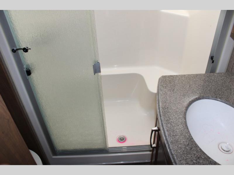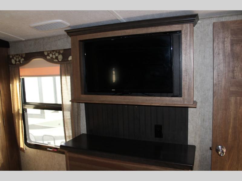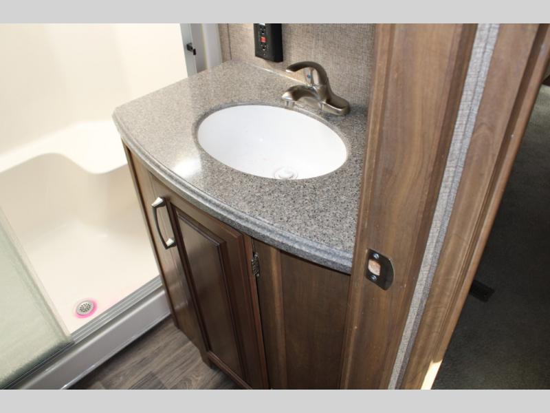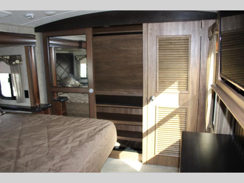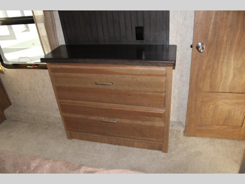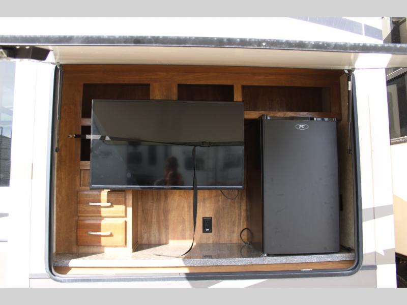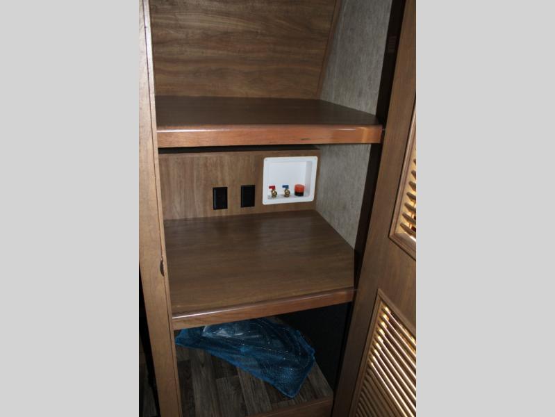 Through the door at the head of the hall leads into a spacious master bedroom in front. Here you can relax and unwind from a full day of adventure. Sleep comfortably on a queen or optional king bed slide out with storage underneath. There is a dresser opposite with overhead HDTV. The front features a closet, plus an area that has been prepped for a stackable washer/dryer.