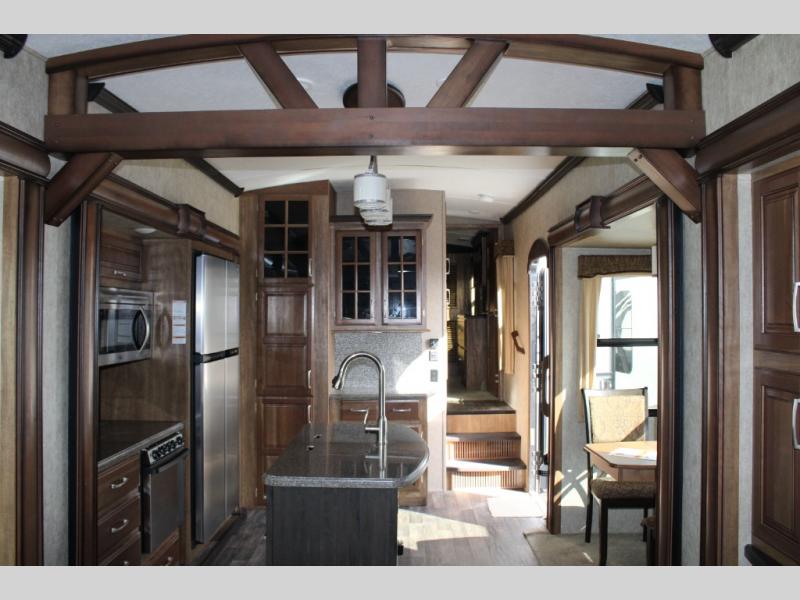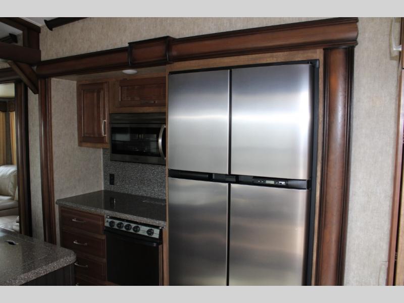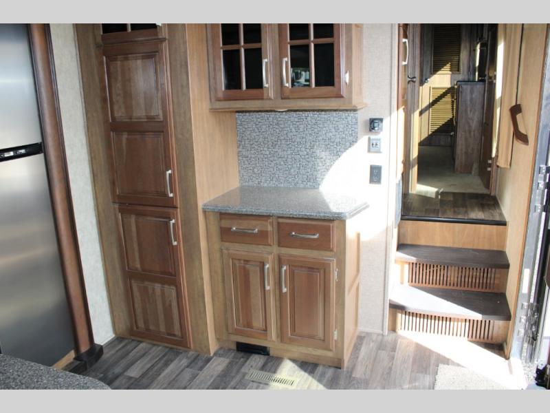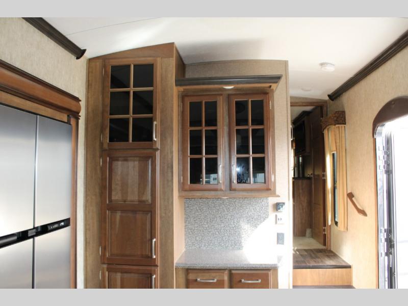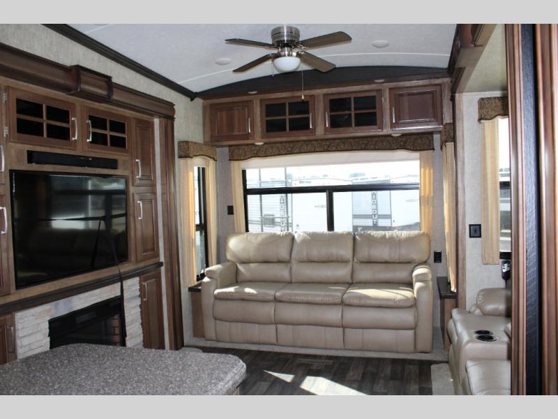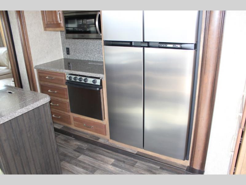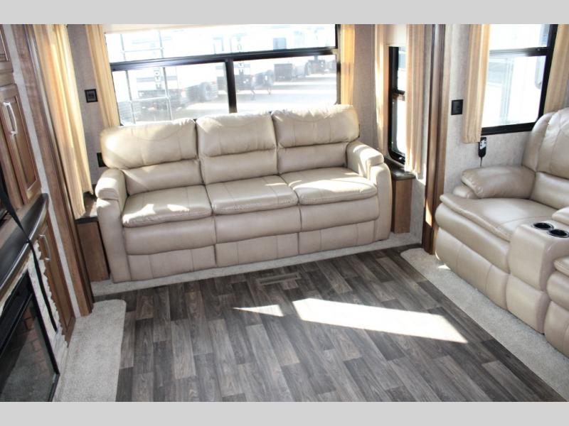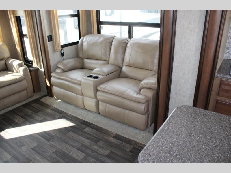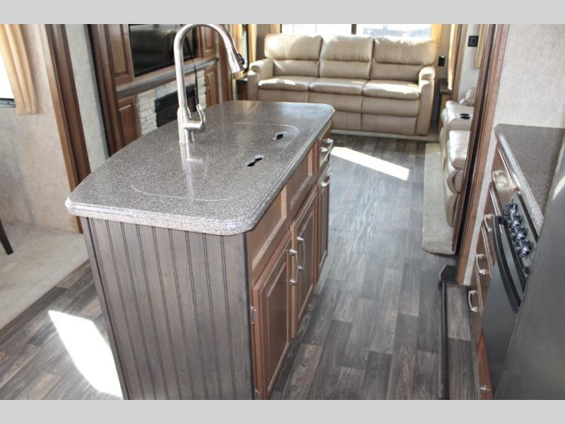 Opposite find a slide out with theater seating, and another slide out with a refrigerator, convection microwave oven, and three burner range. There is also counter space and additional storage. A nice pantry is adjacent along the interior wall straight in from the door which includes additional cabinet space both above and below. A convenient island is available in the center of the room and features double sinks for easy cleanup. Don't forget about the hide-a-bed sofa with end tables and overhead cabinets along the rear wall of the fifth wheel.
