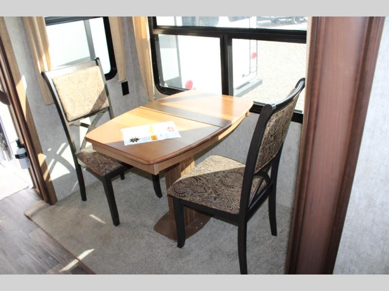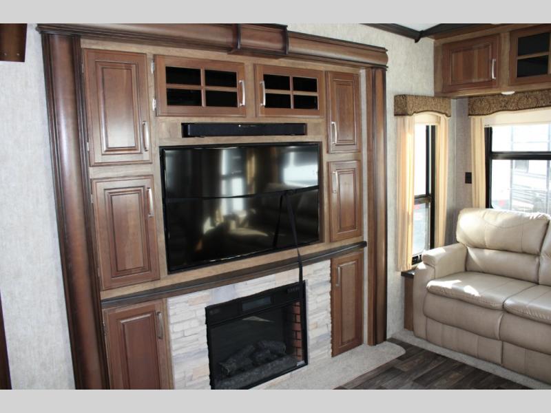 Step inside and be greeted by a wide open interior with a combined kitchen and living area. There is a slide out dining table for four, and a second slide out with an entertainment center, HDTV and fireplace to the left of the door.