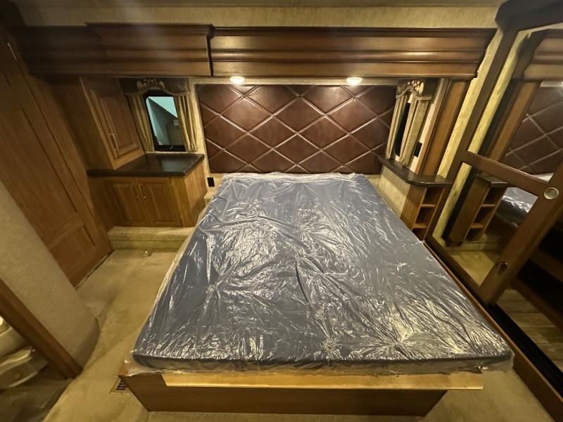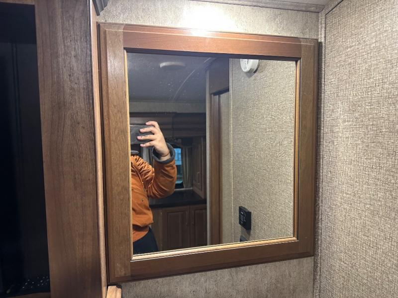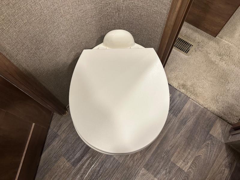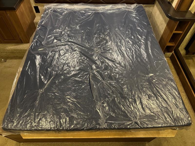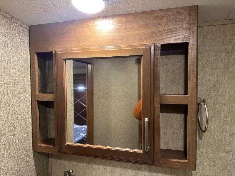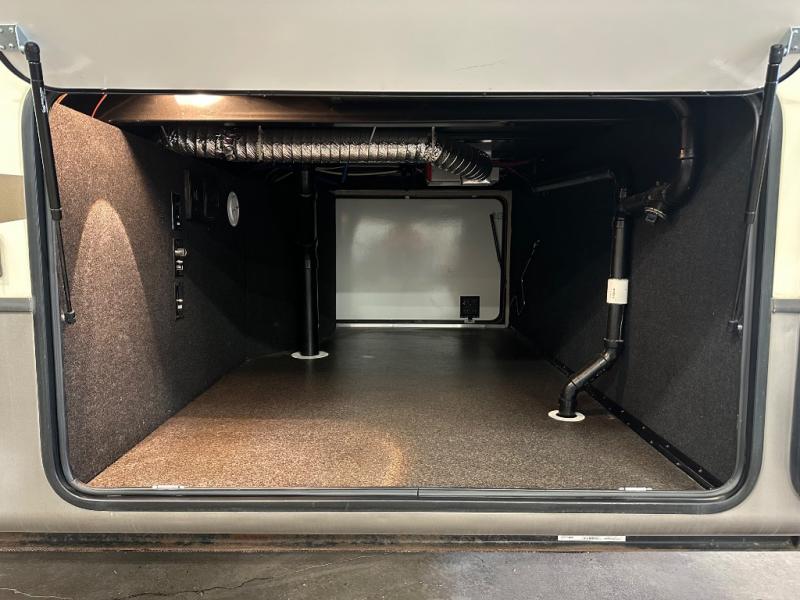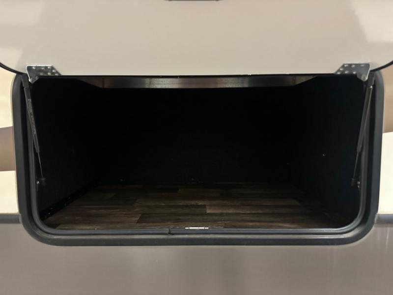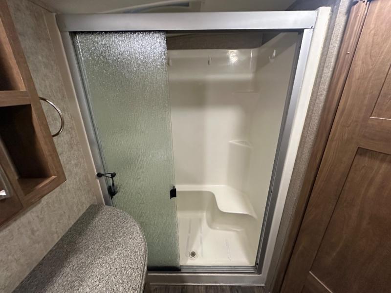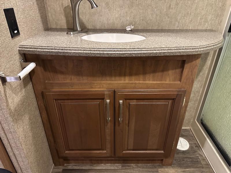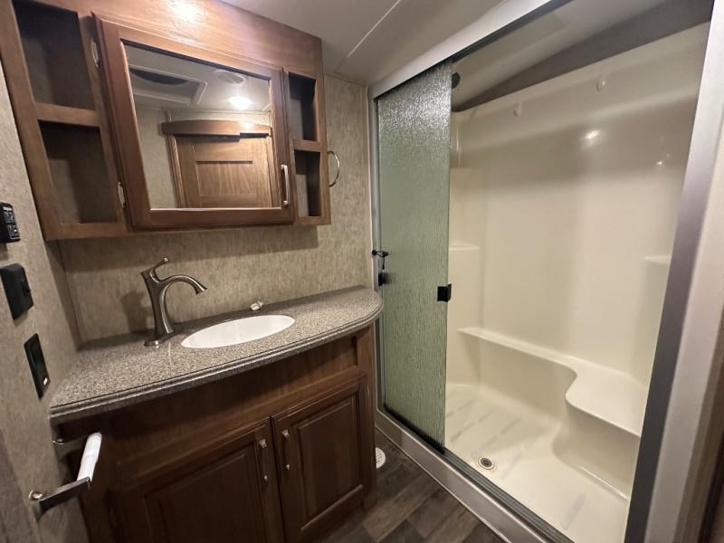 The bath features a 48" x 30" shower with seat, toilet, and vanity with sink. The sliding door in the bath leads to the front master suite. In the hall you will find a slide out space prepped for a washer and dryer that is also connected to the bedroom closet and queen bed slide out. You can choose an optional king bed if you enjoy a bit more sleeping space, and both offer storage underneath.