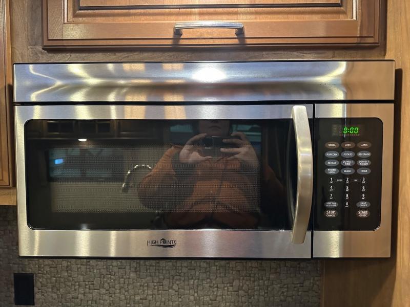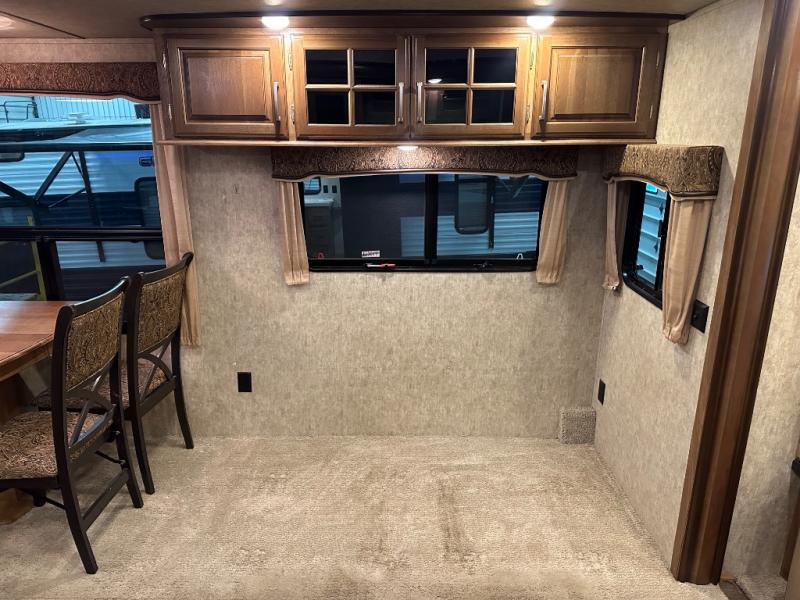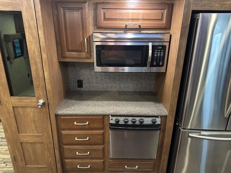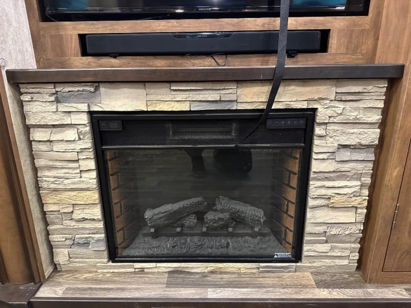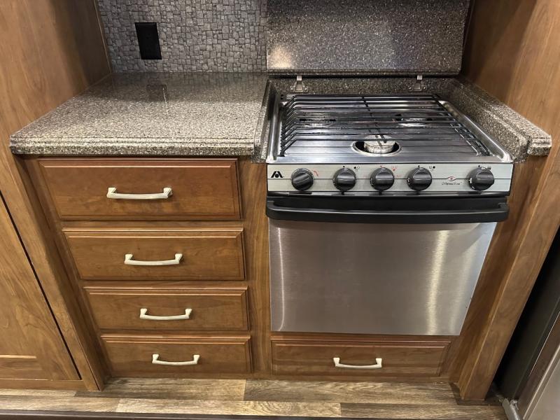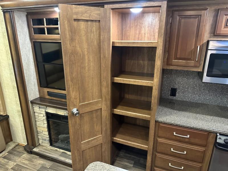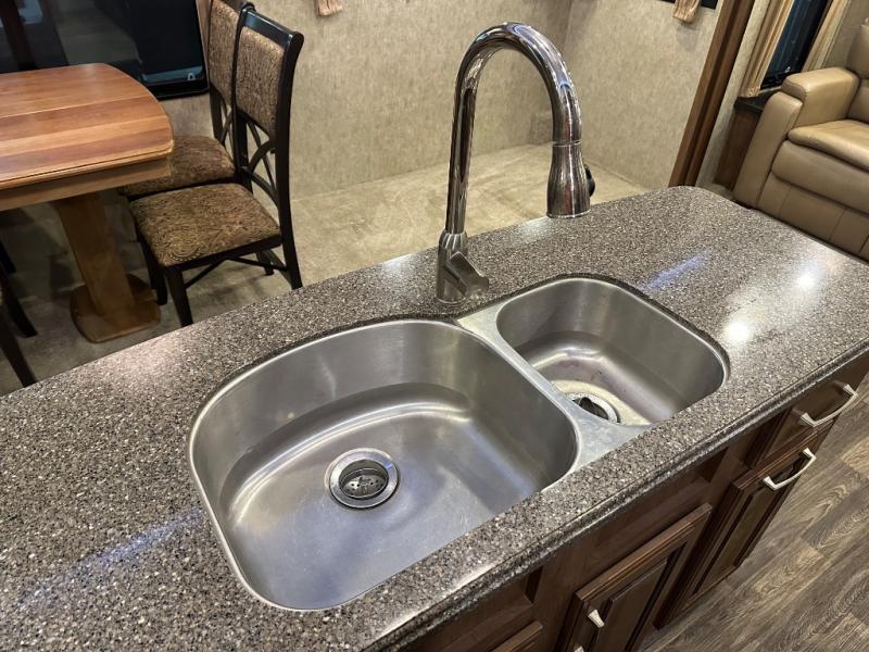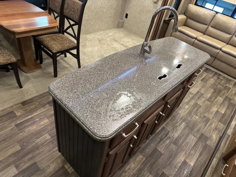 A second slide is found opposite the door and begins with an entertainment center including a HD TV and fireplace adjacent to the sofa. Next, you will find a pantry, counter space, a three burner range, and 18 cu. ft. residential refrigerator slide out. A convenient island offers additional counter space and storage, plus it is the location of a double kitchen sink.