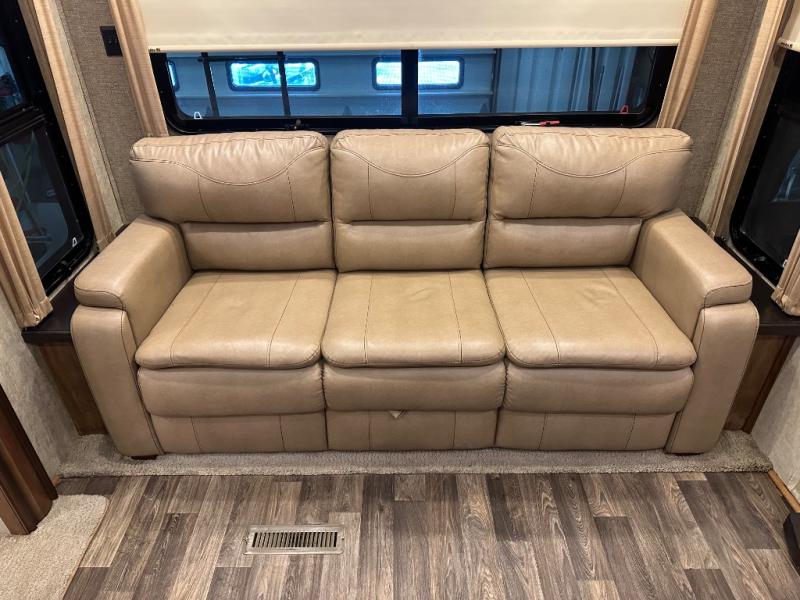 Enter model 3721RL and find a wide open concept living space with dual opposing slides. There is a dinette for four and optional theater seating in a slide out to your immediate left once inside. A nice hide-a-bed sofa fills the rear wall along with dual end tables, plus overhead cabinets the entire width of the unit.