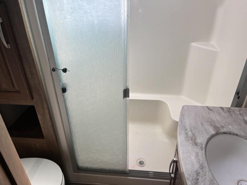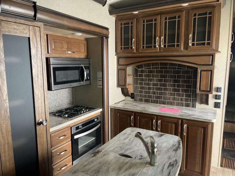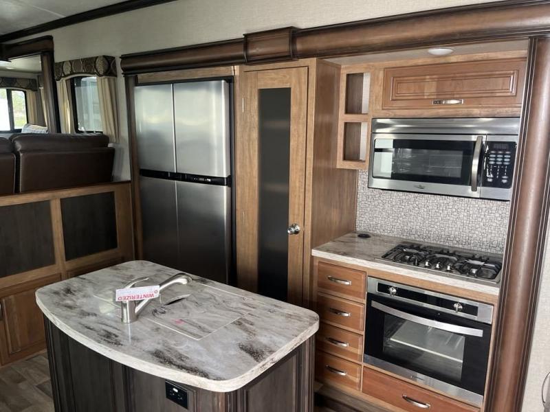Step inside model 3790RD and see just how enjoyable your next camping trip can be with all the space inside. As you enter find a dining table with four chairs in a slide out to the left of the door. Straight ahead there is a slide out refrigerator, pantry, counter space, and three burner range with convection microwave oven. Additional counter space with overhead cabinets and lower storage are straight in from the door along the interior wall. There is also a convenient kitchen island where the double sink is located.