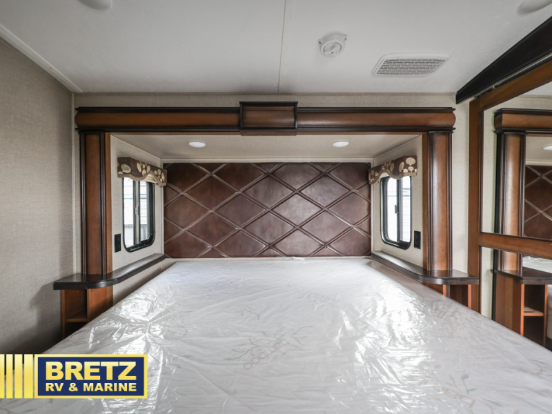 Head toward the rear and step up to find a raised living area with dual opposing slides featuring a hide-a-bed sofa in each. There are also theater seats for added seating, making this space the perfect conversation area. Enjoy watching television on the flat screen TV along the rear wall, and choose the optional fireplace shown in the floor plan image for those cool chilly nights when you just want to stay inside.
