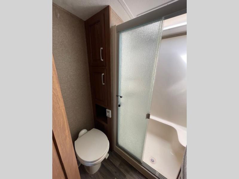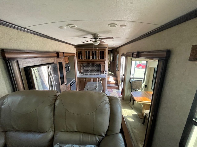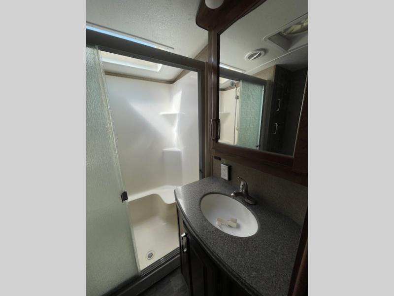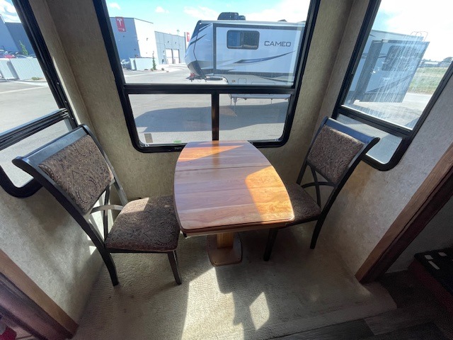 Step inside model 3791RD and see just how enjoyable your next camping trip can be with all the space inside. As you enter find a dining table with four chairs in a slide out to the left of the door. Straight ahead there is a slide out 18 cu. ft residential refrigerator, pantry, counter space, and three burner range with convection microwave oven. Additional counter space with overhead cabinets and lower storage are straight in from the door along the interior wall. There is also a convenient kitchen island where the double sink is located.