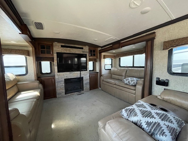 Head toward the rear and step up to find a raised living area with dual opposing slides featuring a hide-a-bed sofa in each. There are also theater seats for added seating, making this space the perfect conversation area. Enjoy watching television on the flat screen TV along the rear wall, and choose the optional fireplace shown in the floor plan image for those cool chilly nights when you just want to stay inside.