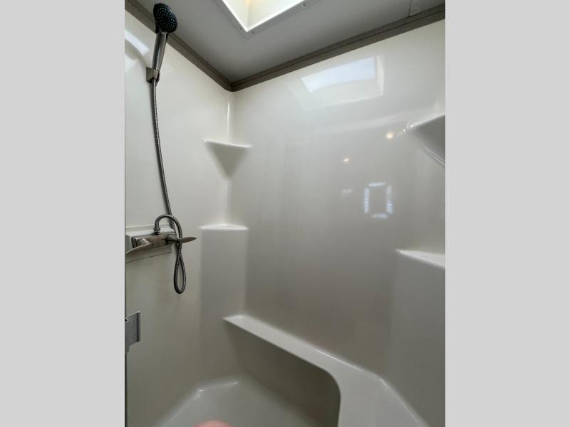Opposite the door side find a slide out including a free standing table with four chairs, and optional theater seating for two with cup holders. There is a nice entertainment center along the interior wall beside the kitchen slide that can easily be viewed by any seating in the room. This space has a 40" HDTV and fireplace.
