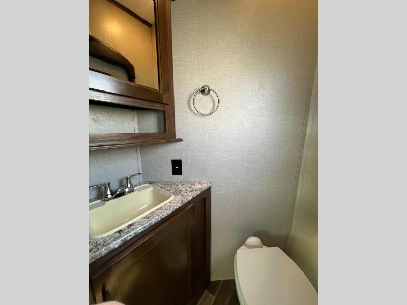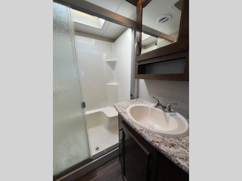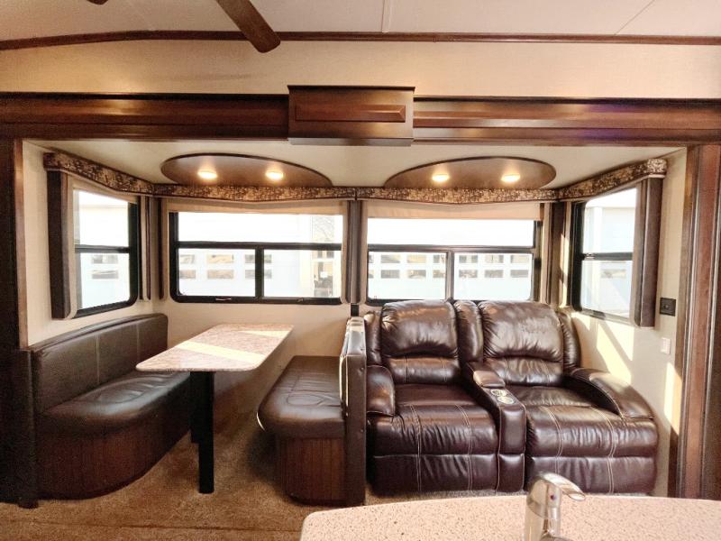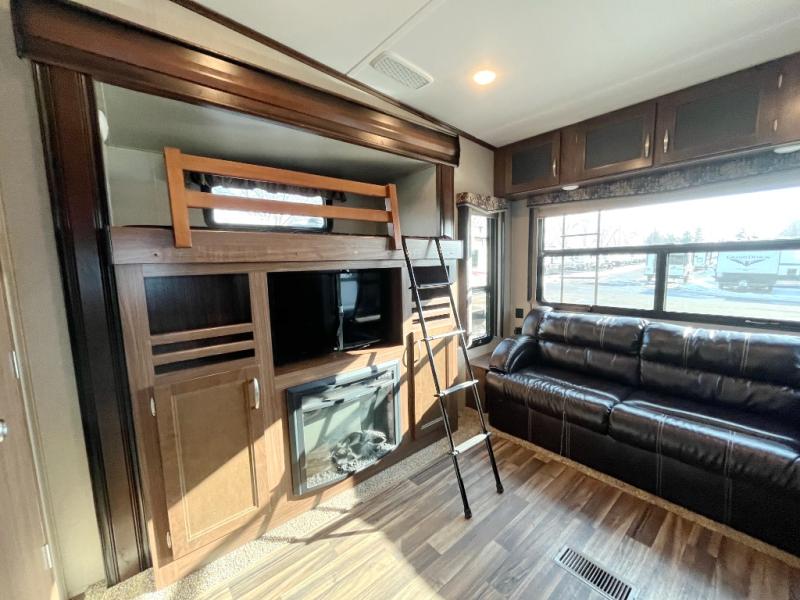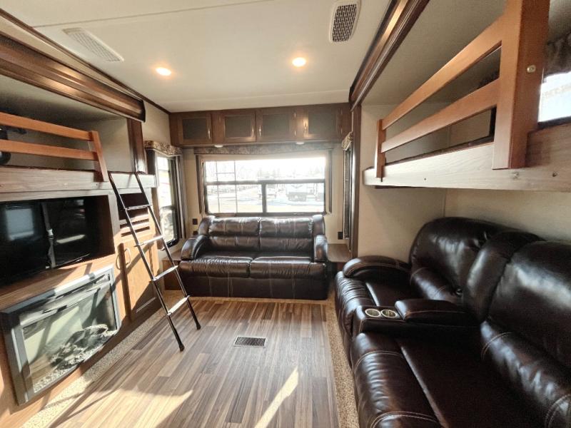 The very rear of this unit features a den with bunks and a door to close off the space from the rest of the fifth wheel. Along the road side there is a slide out including theater seating for two with a fold down bunk above. On the opposite side enjoy a 32" HDTV with fireplace and a bunk bed above. Along the rear wall there is a hide-a-bed sofa. The den has access to the half bath that includes a toilet and sink. Plus the second entry into the fifth wheel leads into the half bath allowing quick entry when outside.