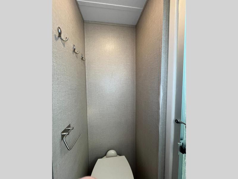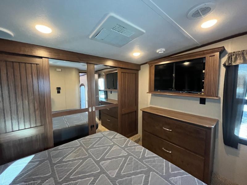 Further down the hall find the master bedroom with a slide out queen bed including storage underneath, plus nightstands. Opposite find a dresser with a 32" HDTV above which is perfect for catching the end of a good movie before retiring for the night. The front wall features a spacious wardrobe and additional storage.