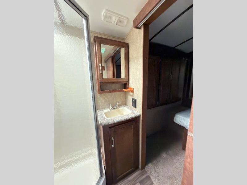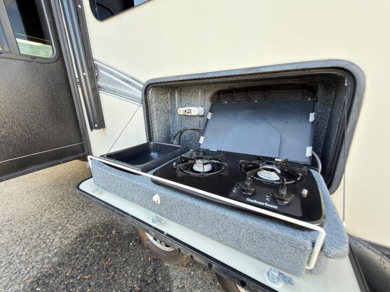 Outdoors notice the handy outside camp kitchen which features a single sink and dual burner cooktop. The front pass-through storage compartment will also allow you to stow away all of your outdoor camping gear, and so much more!