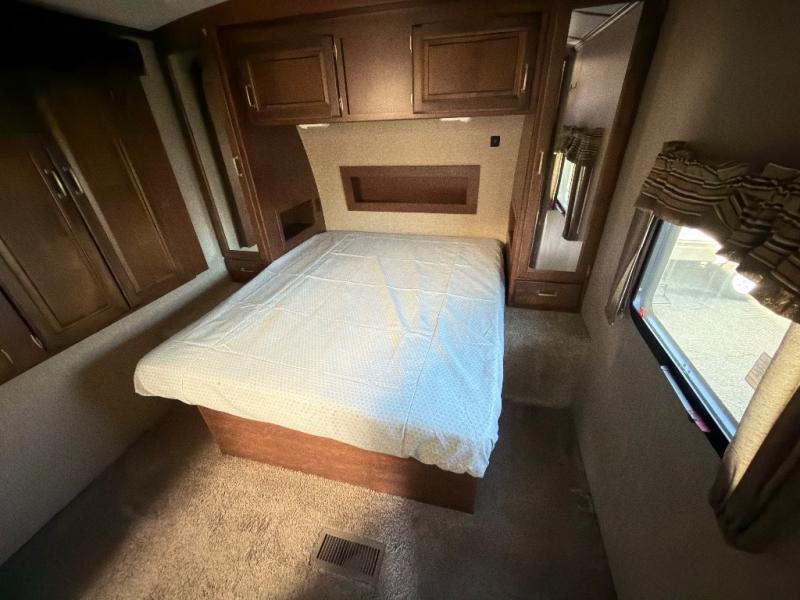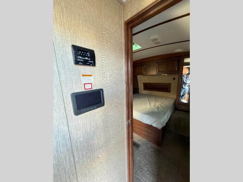 As you make your way to the open living area notice the rear wall entertainment center with overhead cabinets, and a pop-up LCD TV. There are also storage cabinets below for your things. You can easily enjoy conversations or watch television from the theater seats in the slide along the curb side, or from the sofa sleeper with overhead cabinets in the slide on the opposite side which also includes a nice booth dinette for dining.