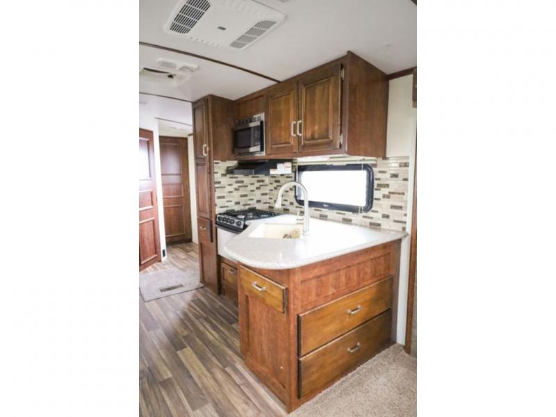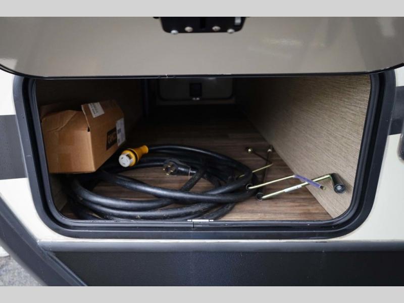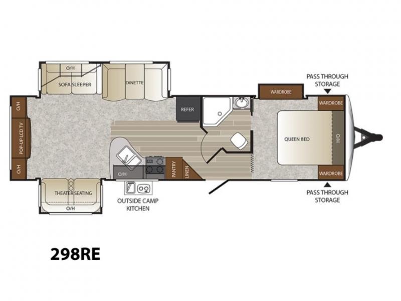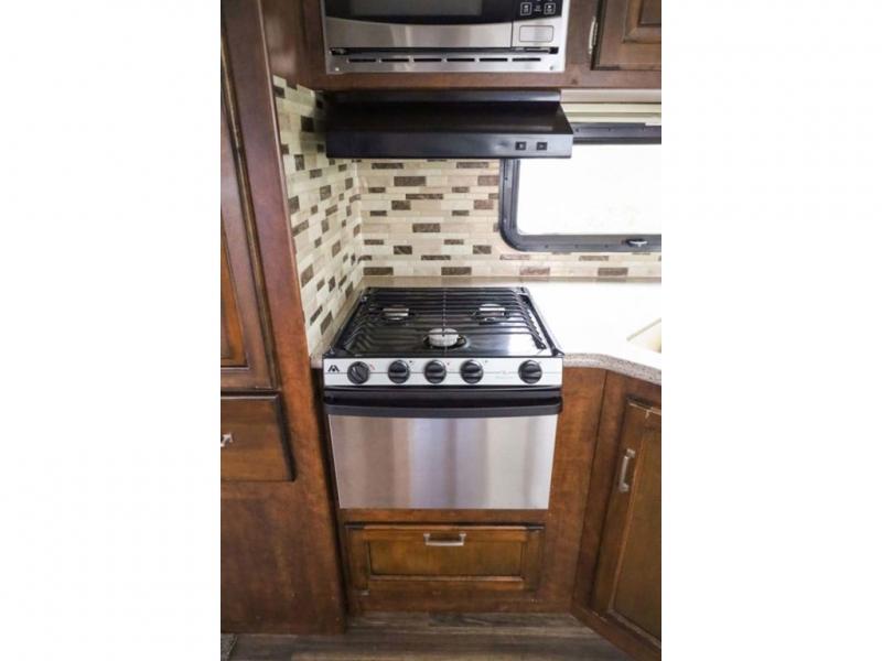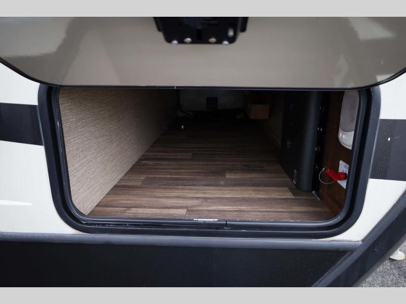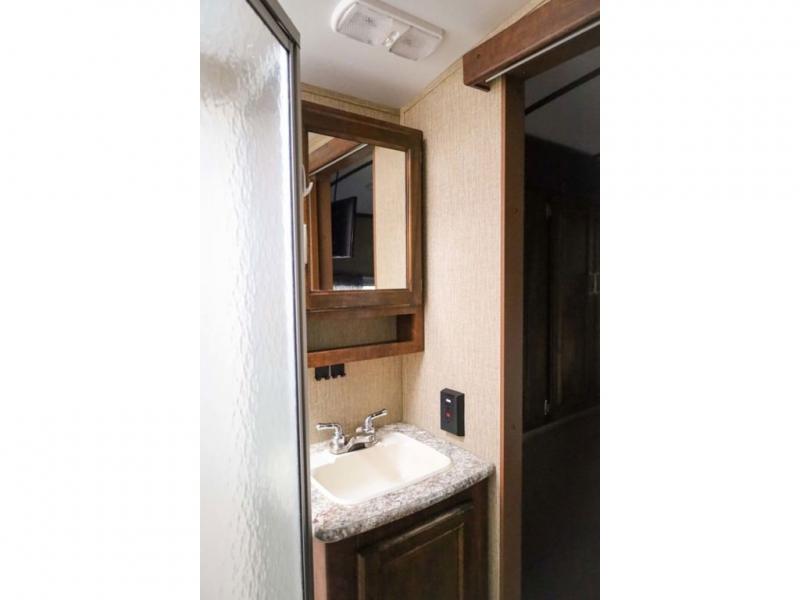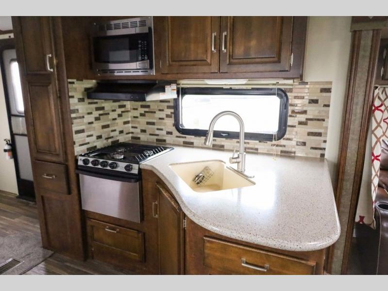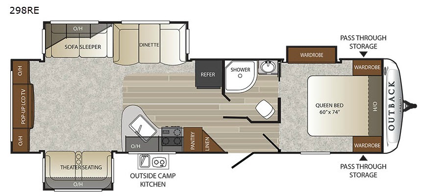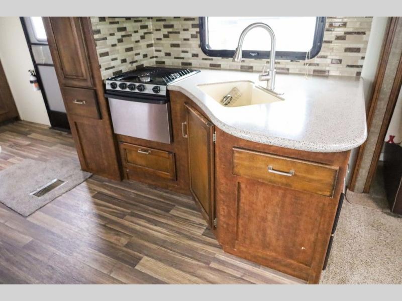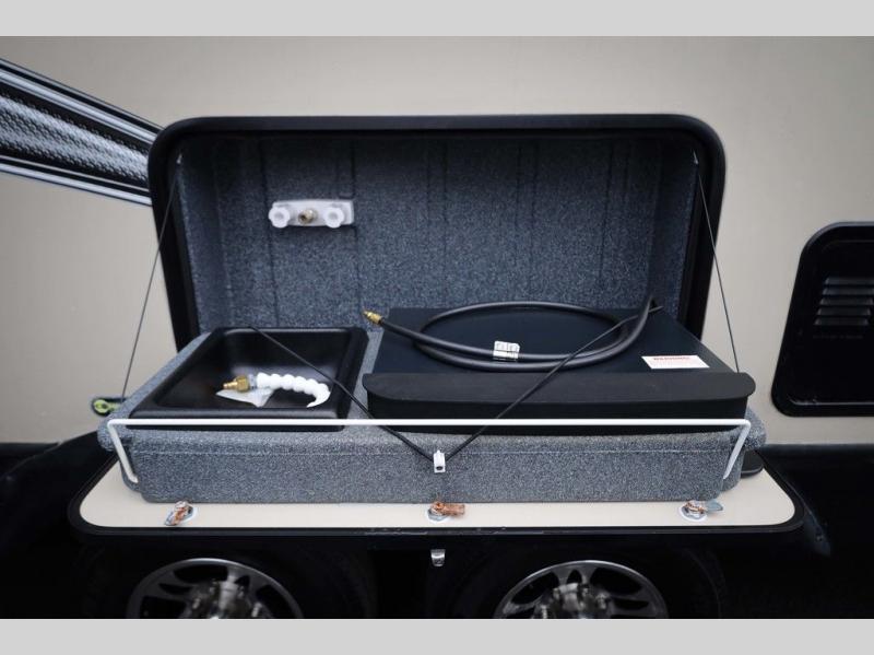 Outdoors notice the handy outside camp kitchen which features a single sink and dual burner cooktop. The front pass-through storage compartment will also allow you to stow away all of your outdoor camping gear, and so much more!