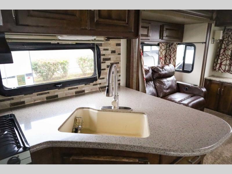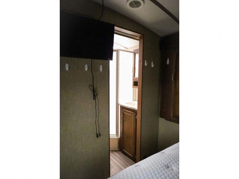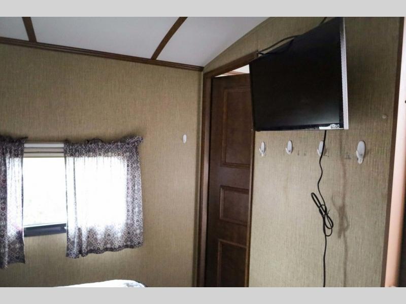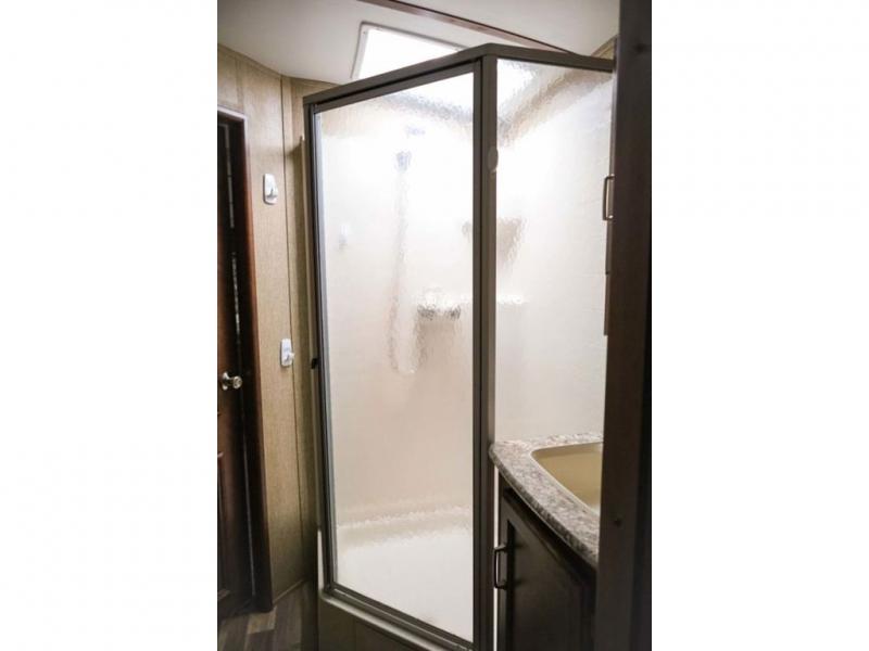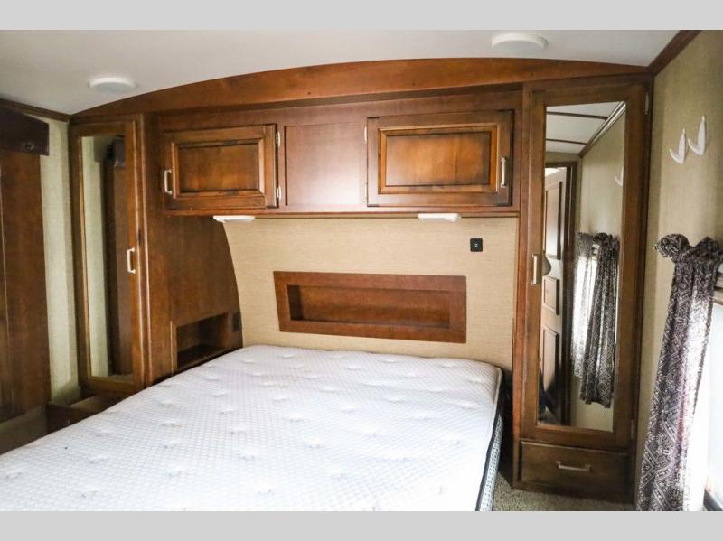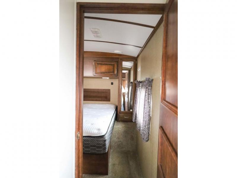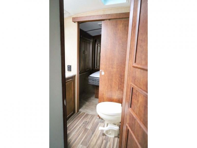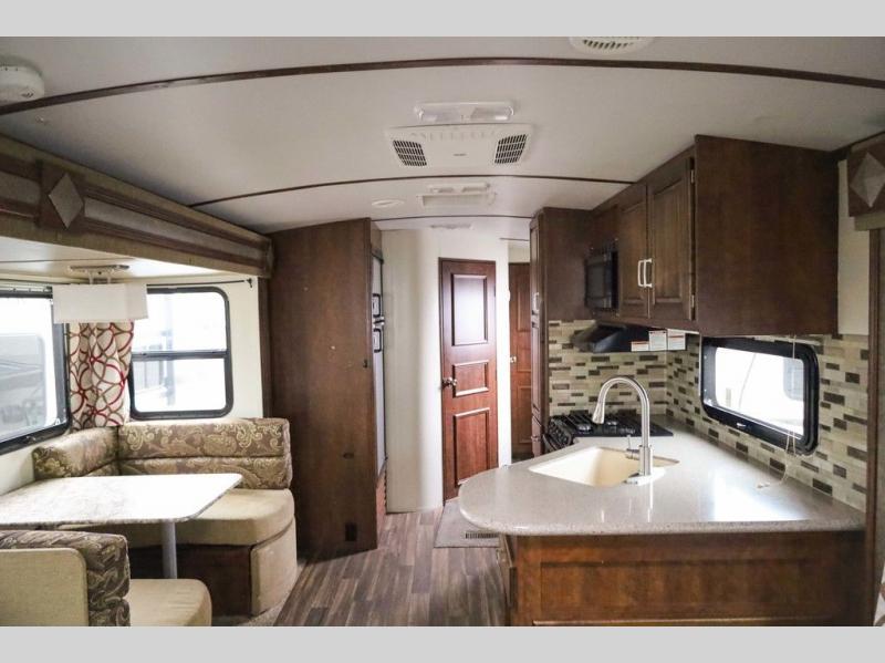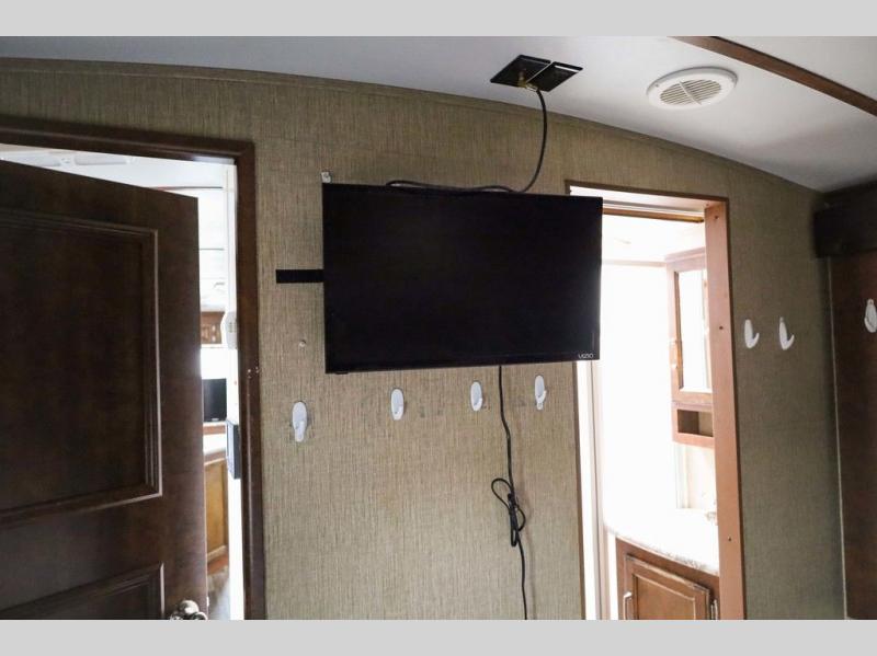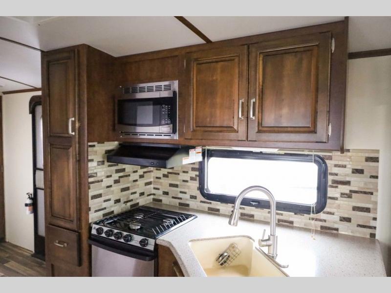 Outdoors notice the handy outside camp kitchen which features a single sink and dual burner cooktop. The front pass-through storage compartment will also allow you to stow away all of your outdoor camping gear, and so much more!