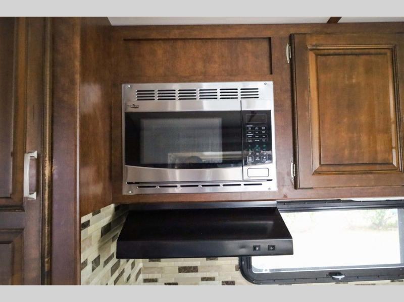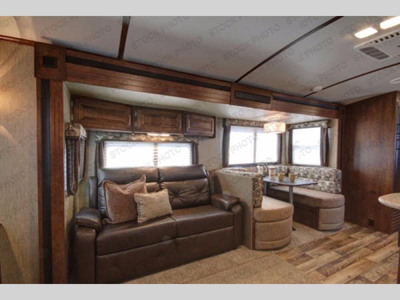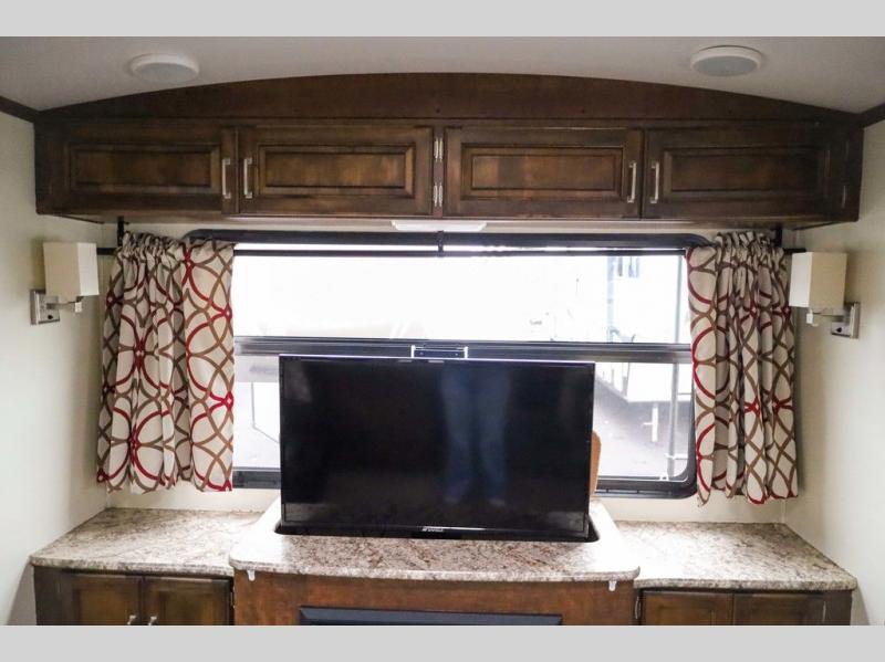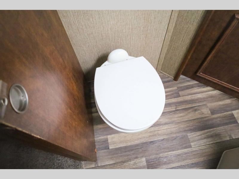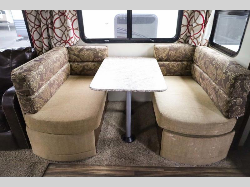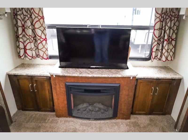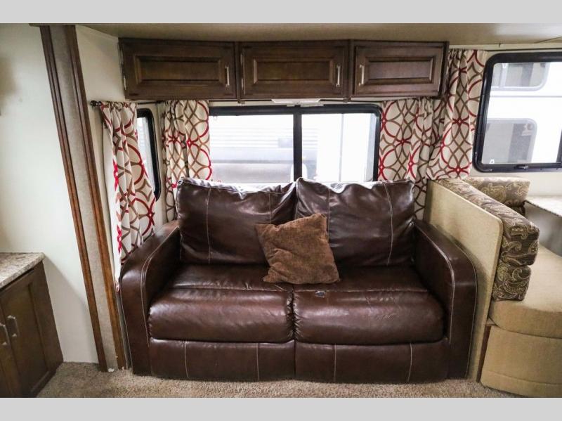 As you make your way to the open living area notice the rear wall entertainment center with overhead cabinets, and a pop-up LCD TV. There are also storage cabinets below for your things. You can easily enjoy conversations or watch television from the theater seats in the slide along the curb side, or from the sofa sleeper with overhead cabinets in the slide on the opposite side which also includes a nice booth dinette for dining.