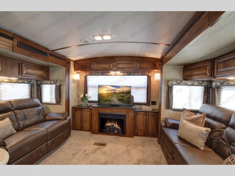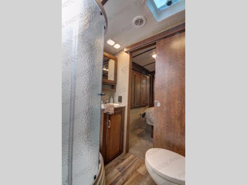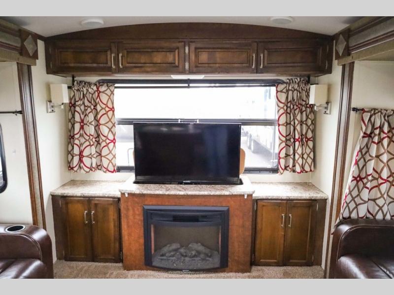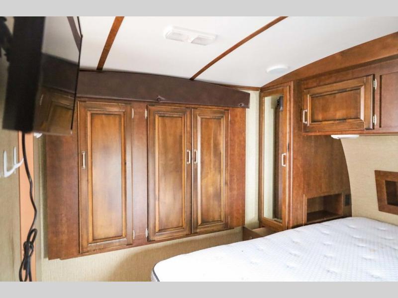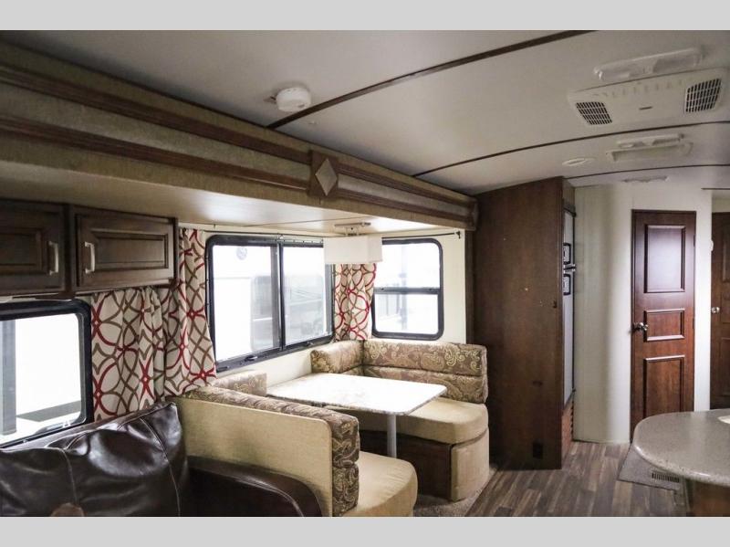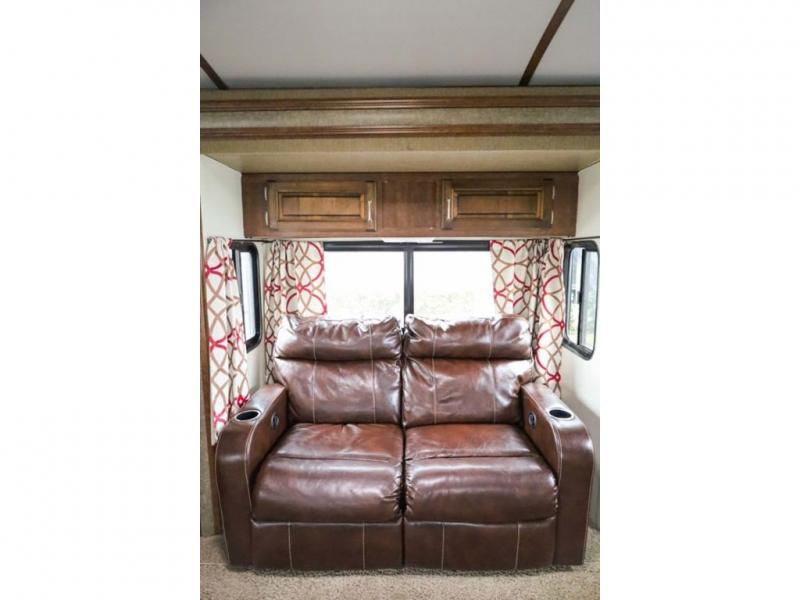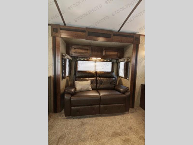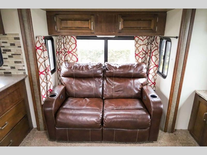 As you make your way to the open living area notice the rear wall entertainment center with overhead cabinets, and a pop-up LCD TV. There are also storage cabinets below for your things. You can easily enjoy conversations or watch television from the theater seats in the slide along the curb side, or from the sofa sleeper with overhead cabinets in the slide on the opposite side which also includes a nice booth dinette for dining.
