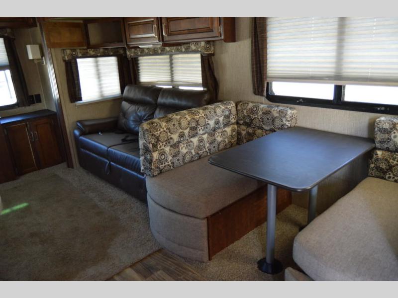As you make your way to the open living area notice the rear wall entertainment center with overhead cabinets, and a pop-up LCD TV. There are also storage cabinets below for your things. You can easily enjoy conversations or watch television from the theater seats in the slide along the curb side, or from the sofa sleeper with overhead cabinets in the slide on the opposite side which also includes a nice booth dinette for dining.