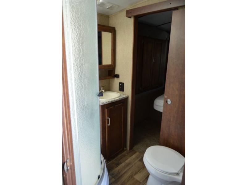 Outdoors notice the handy outside camp kitchen which features a single sink and dual burner cooktop. The front pass-through storage compartment will also allow you to stow away all of your outdoor camping gear, and so much more!