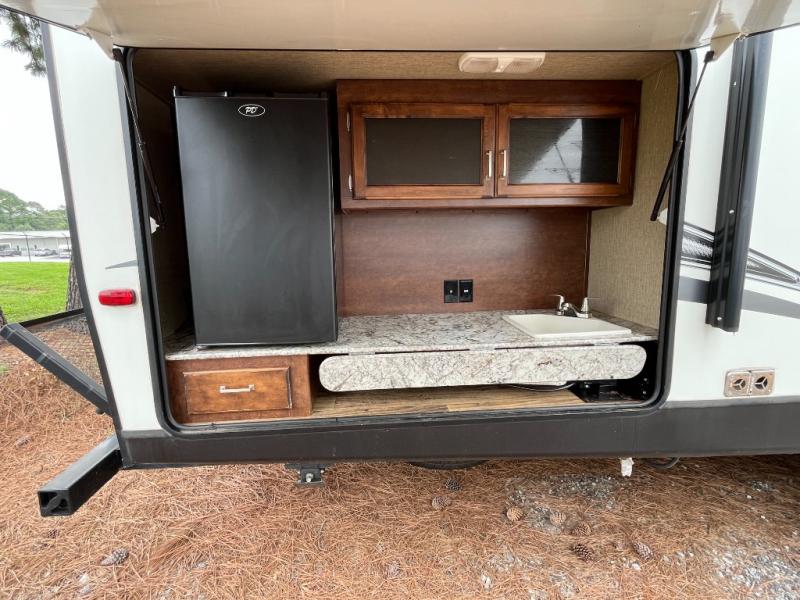 The outside kitchen is sure to catch your eye. There is a refrigerator, single kitchen sink, and flip-out stove top. You will also appreciate the storage that can be found in the front exterior pass-through compartment, plus much much more!
