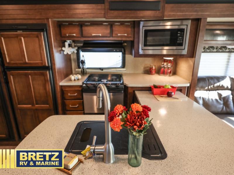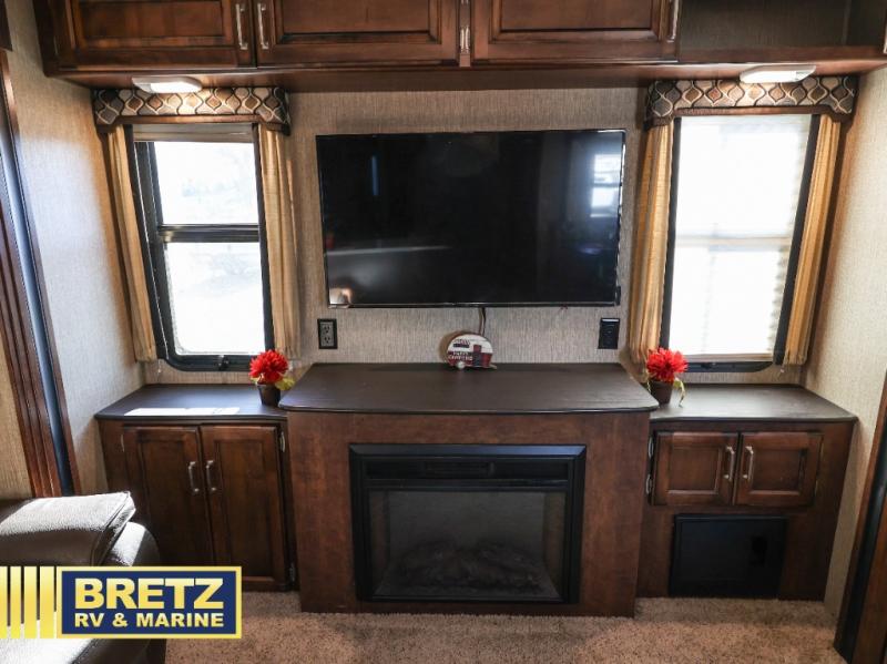 Opposite the sofa within the kitchen slide out there is theater seating for two with cup holders and storage above. The rear full wall entertainment center features storage on either side of a flat screen TV.