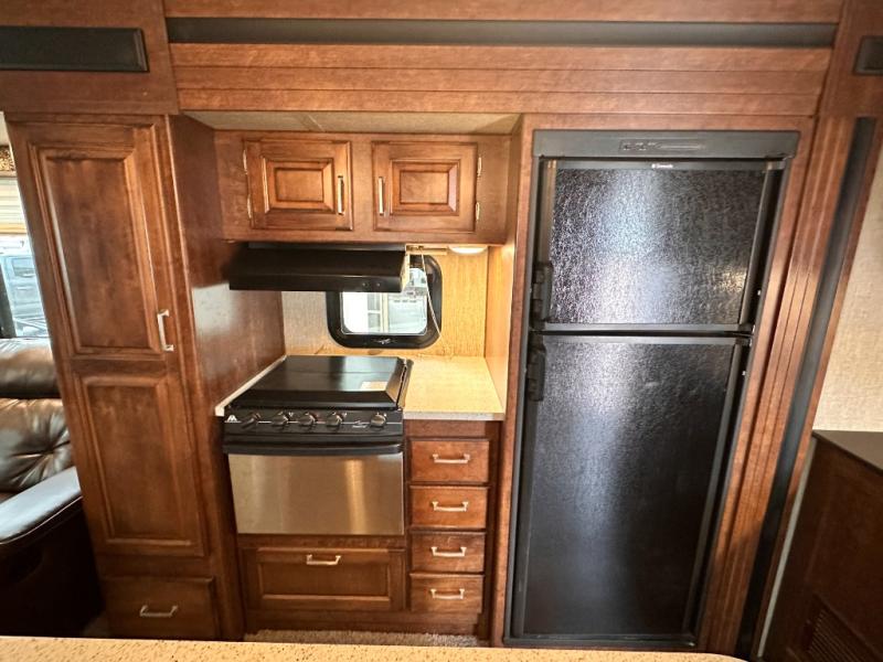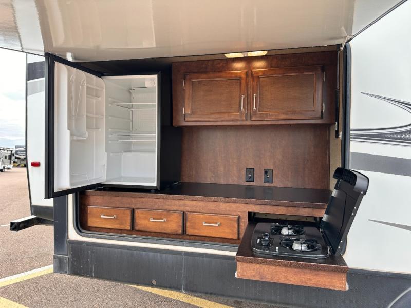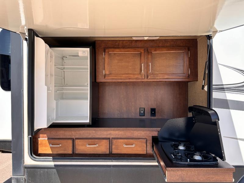 Before you step foot inside 330RL, be sure to check out the outdoor kitchen. Here you will find a two-burner flip-out stove, a refrigerator, and an overhead cabinet. Now you can spend more time outdoors with your family, while fixing quick snacks or a light meal.