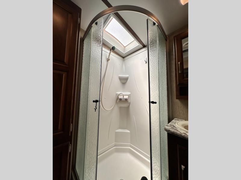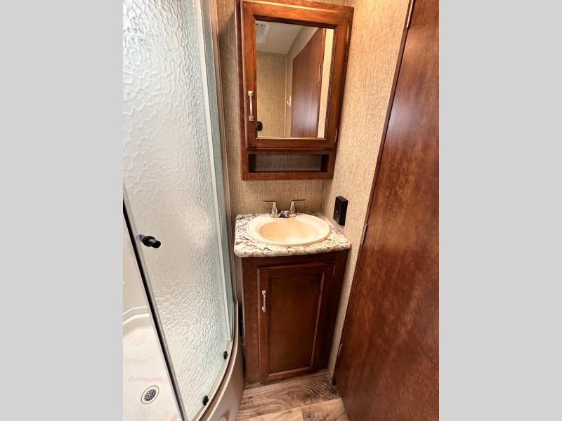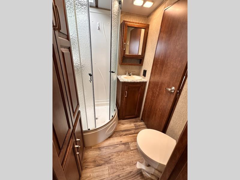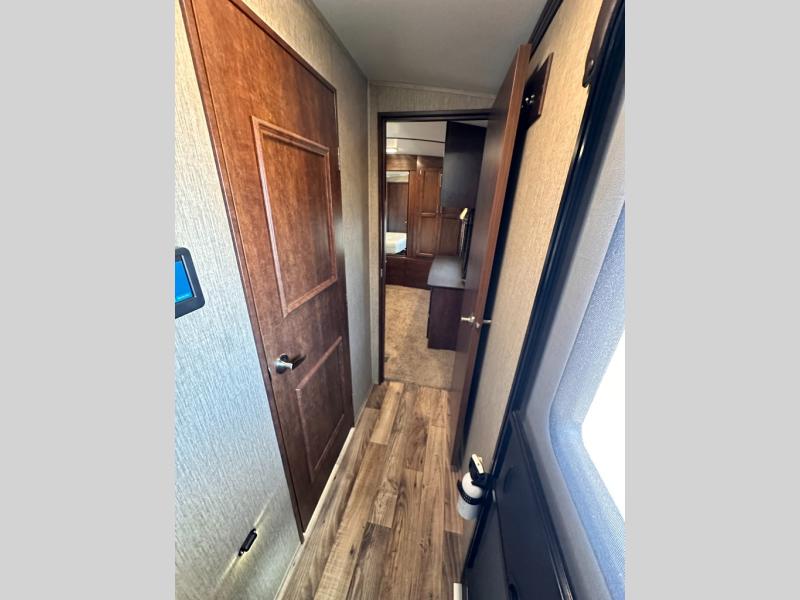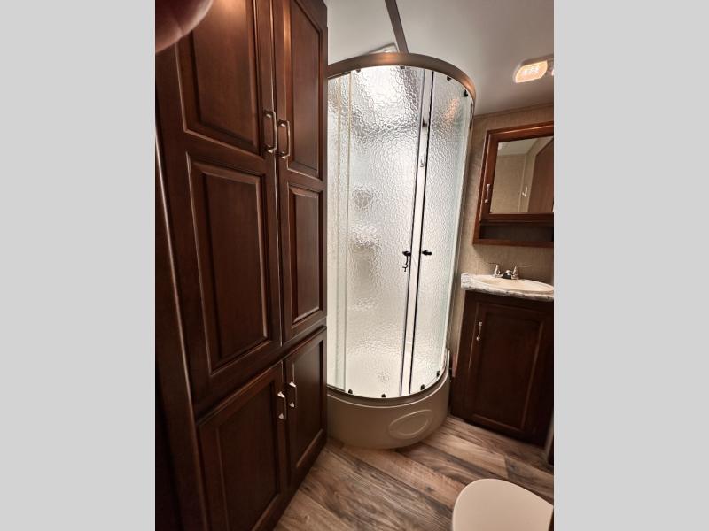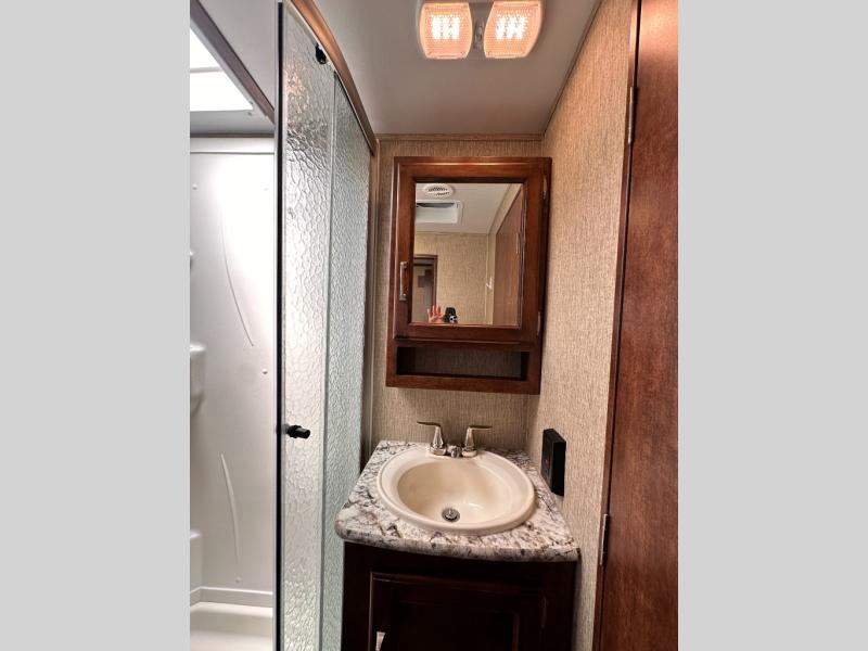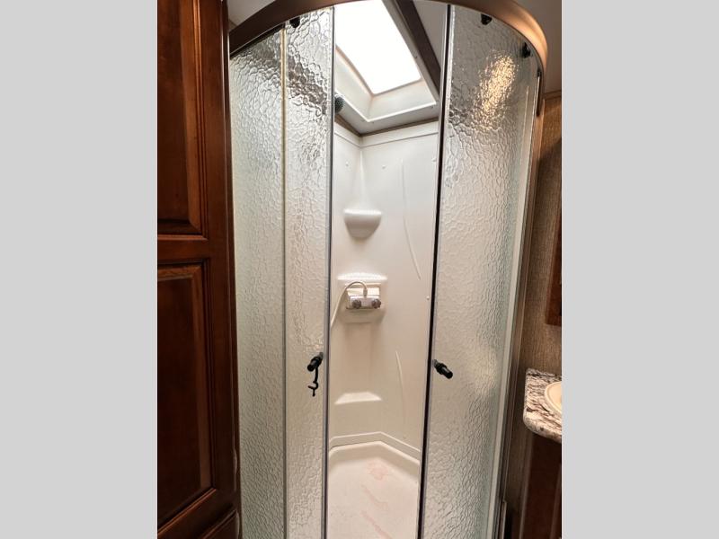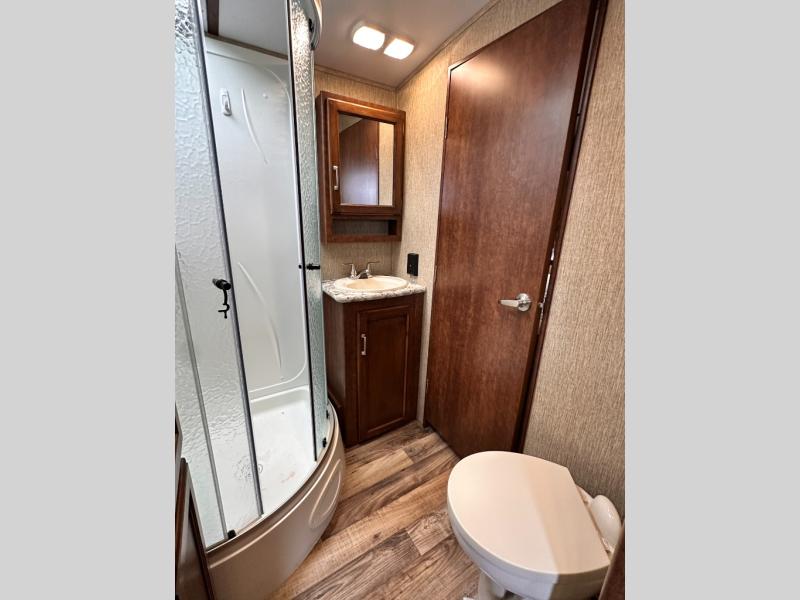 As you enter the trailer you will see the bathroom. Here you will find a linen cabinet, radius shower, sink, and a toilet. A second sliding door separates the bathroom from the master bedroom.