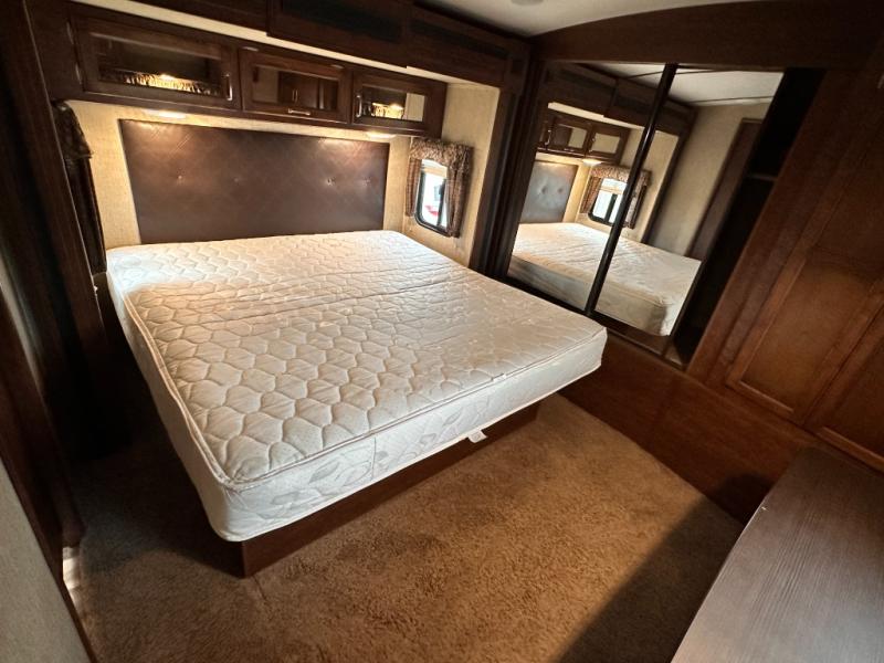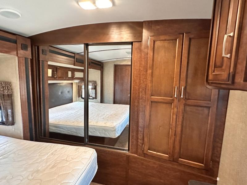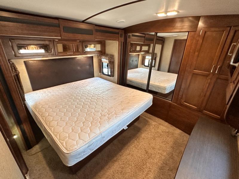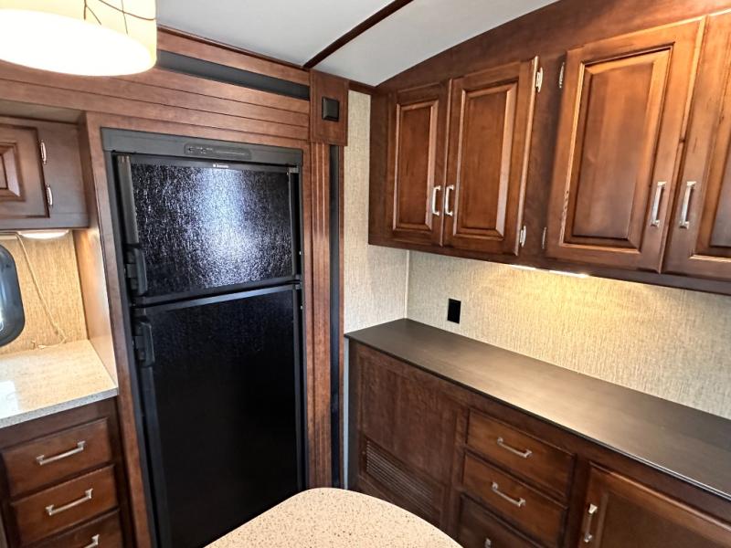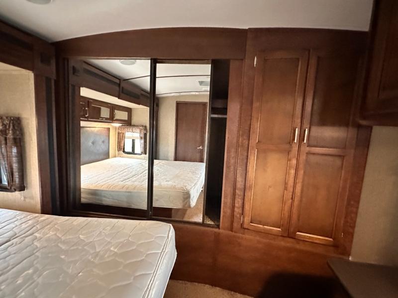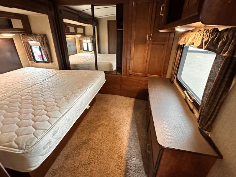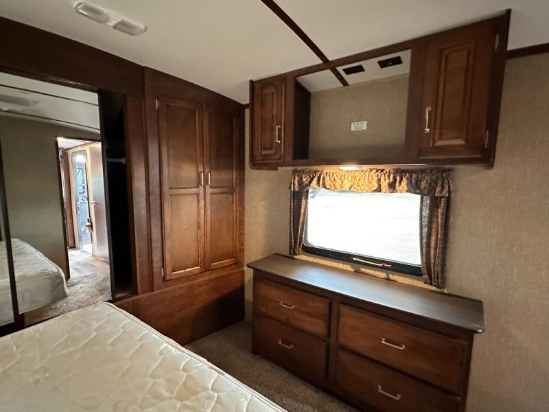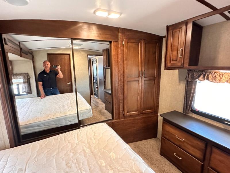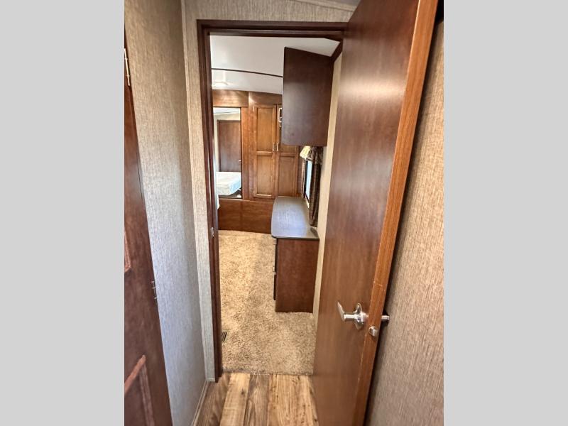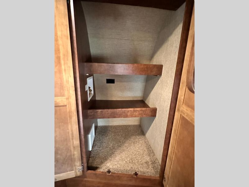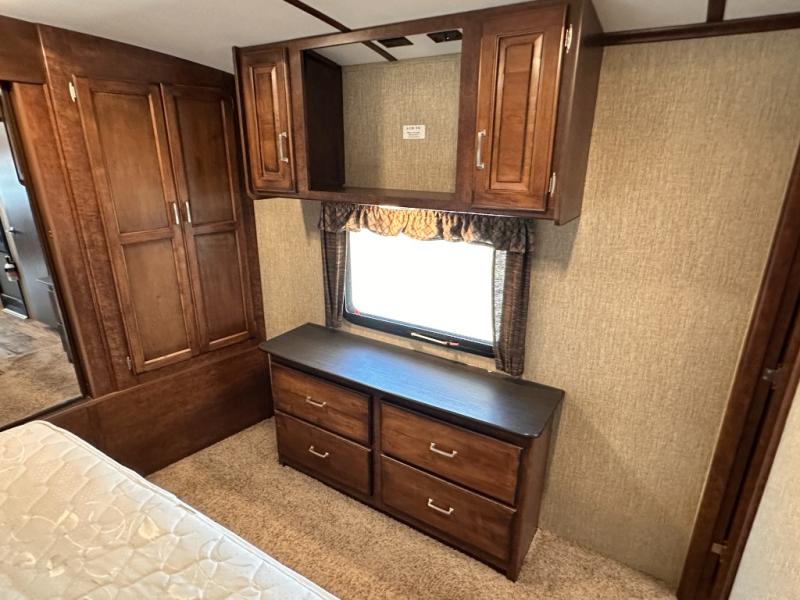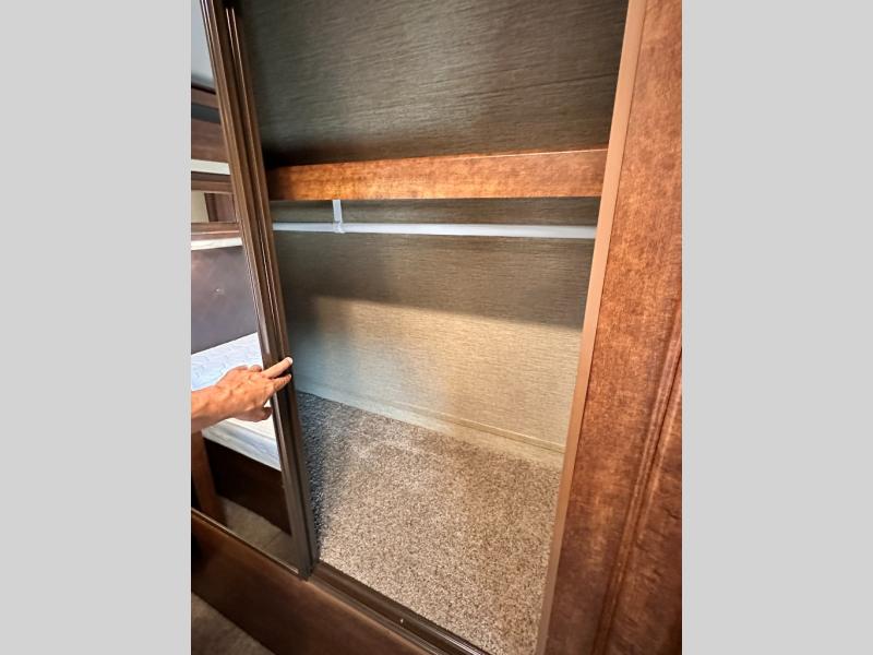 In the front bedroom there is a slide out with a king bed and overhead cabinets. Across from the bed there is a dresser and overhead cabinets for more storage. Along the front wall you will find a large wardrobe, plus an area that has been washer/dryer prepped for your convenience. Now you won't have to bring home any dirty clothes!