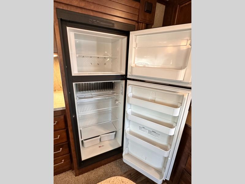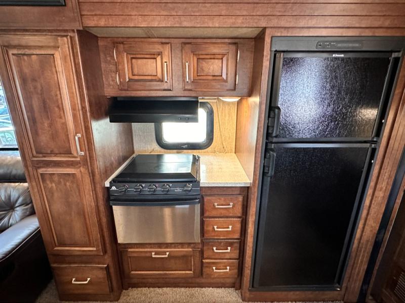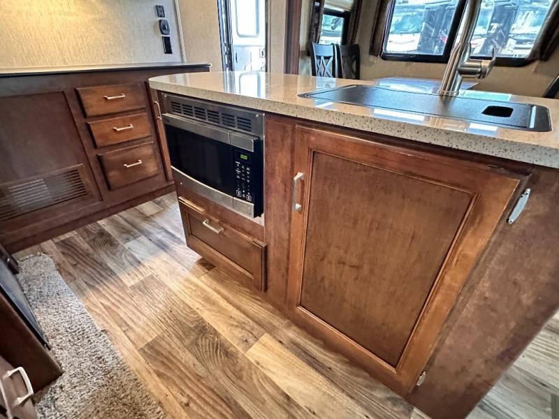 In the combined kitchen and living area there are dual opposing slide outs which help to open up the floor space. The slide out along the door side features a free-standing dinette plus an entertainment center. Along the rear wall you will find a sofa sleeper with end tables and more overhead storage. The slide out along the road side has theater seats, a pantry, three burner range, and a refrigerator. Adjacent to the slide out, and along the interior wall there is a larger pantry for more non-perishables. In the kitchen area you will also find an island with a large sink.