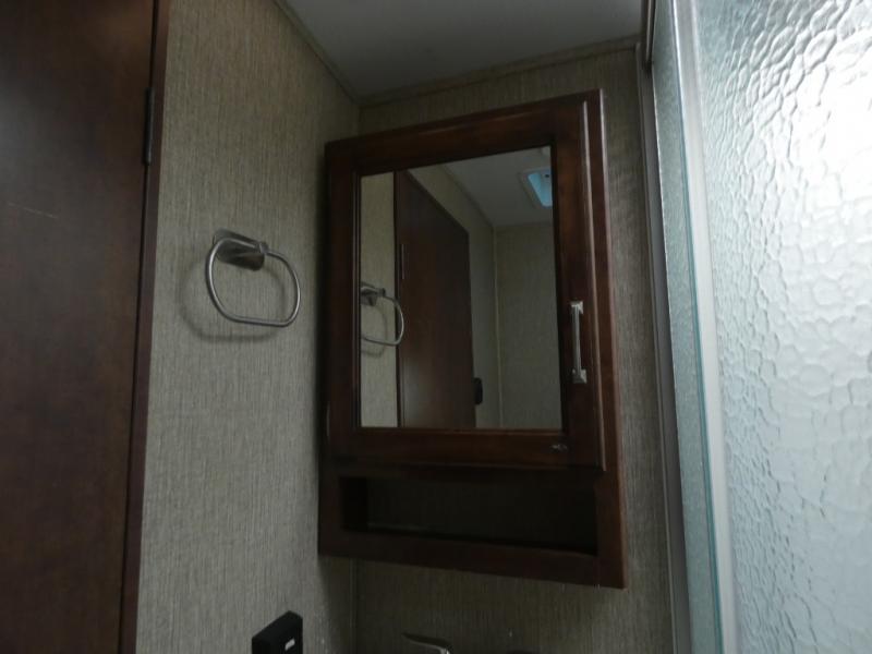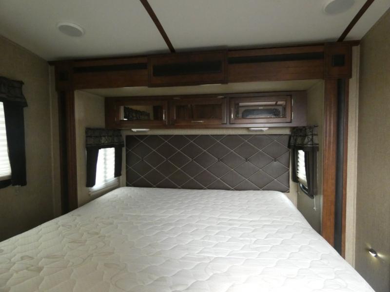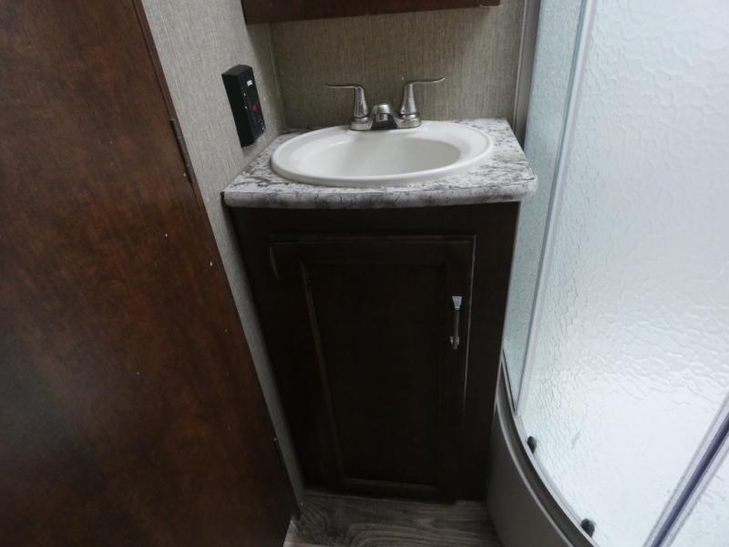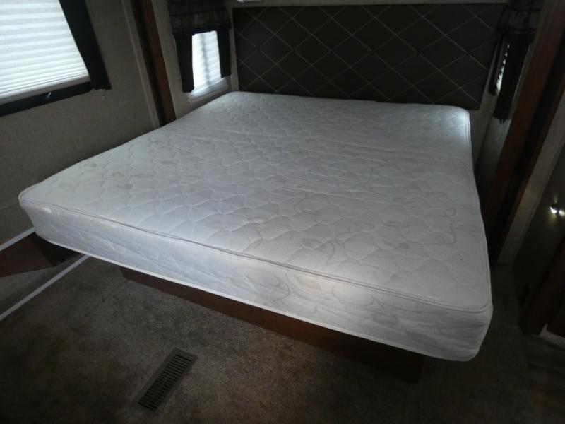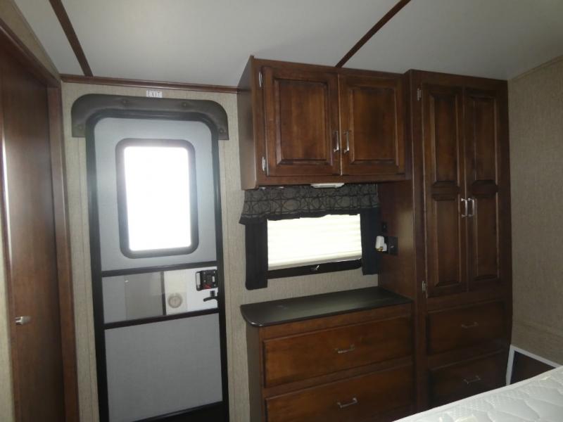 Retreat to the bedroom at night where you will get a good night's rest on the king bed. For added floor space the bed is on a slide out, and above there is an overhead cabinet. Across from the bed you will find plenty of storage thanks to the dresser and wardrobe. Near the dresser there is the second entry door which leads you outside.