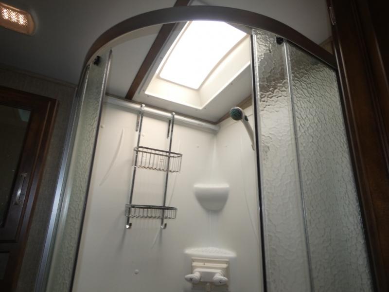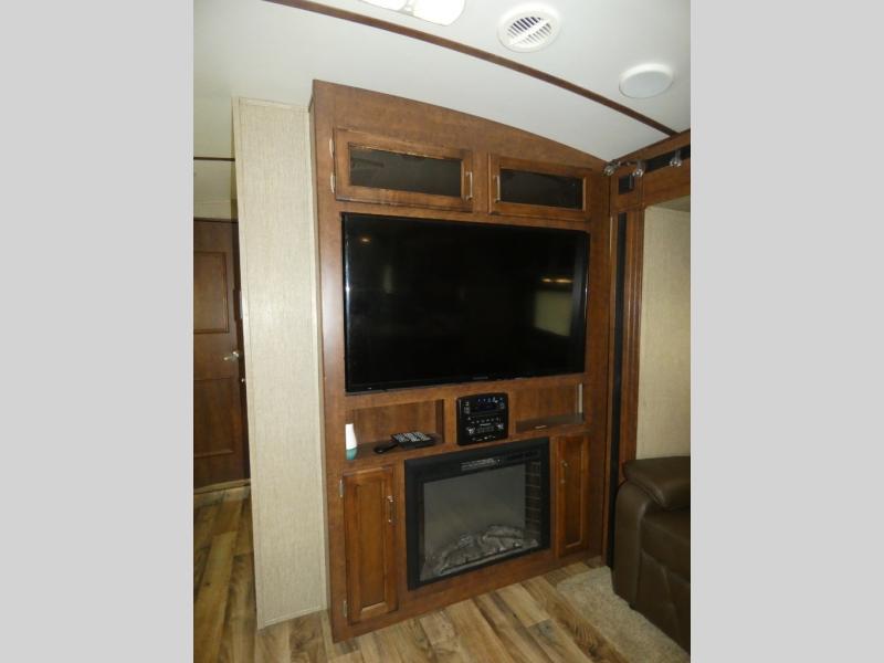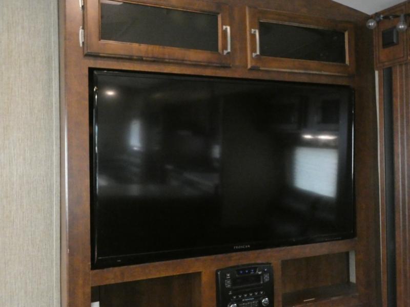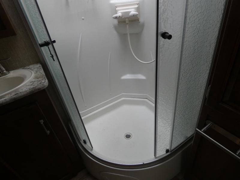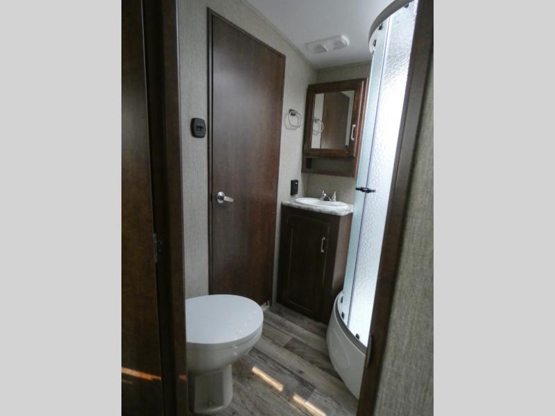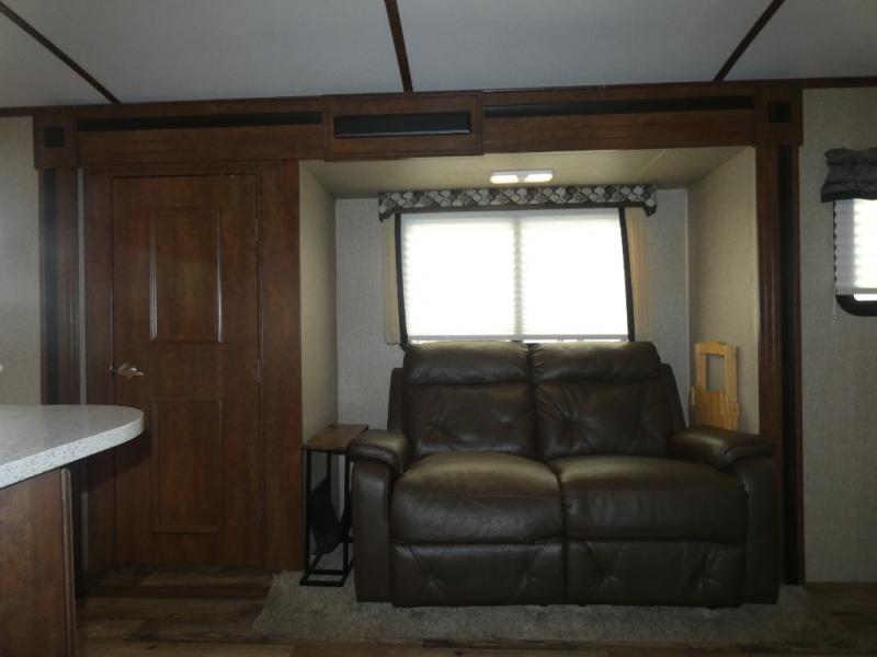 As you enter through the main door, you will find yourself in the kitchen area. Along the front of the trailer there is a u-dinette where you can enjoy your meals, and at night use this area for additional sleeping space. The PanaView window provides a perfect view to all your surroundings. The slide out along the door side features a large pantry and theater seating. On the opposite side of the trailer the slide out includes a refrigerator, three burner range, overhead cabinets, and a sleeper sofa. There is also a L-shaped counter with a large sink. Adjacent to the sofa sleeper, along the interior wall there is an entertainment center for your enjoyment. Here you can watch movies or your favorite shows.
