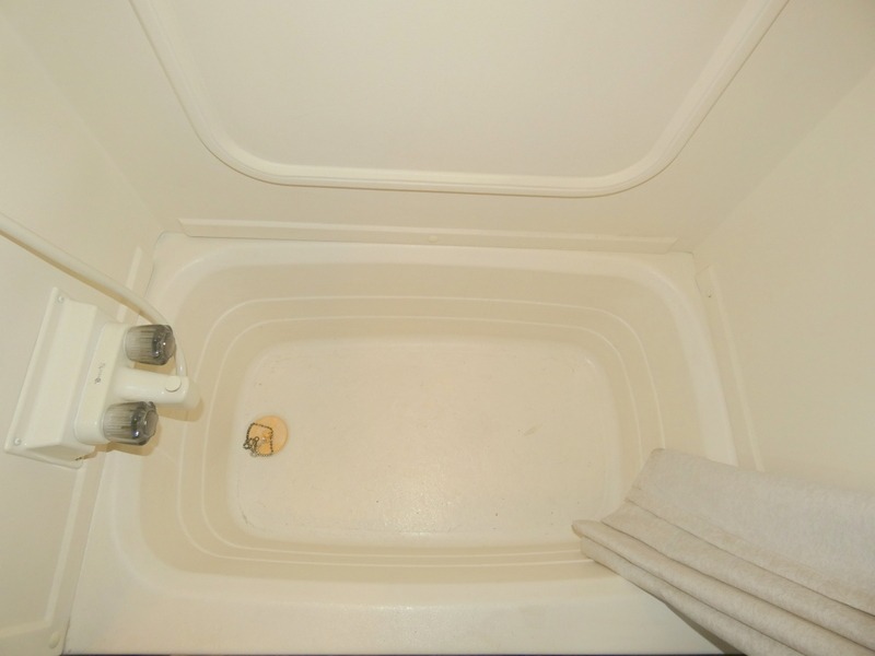 Straight in from the entry door you will find a bathroom with a toilet, shower, sink, and linen cabinet.