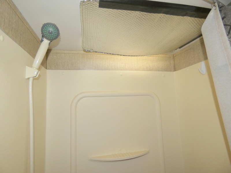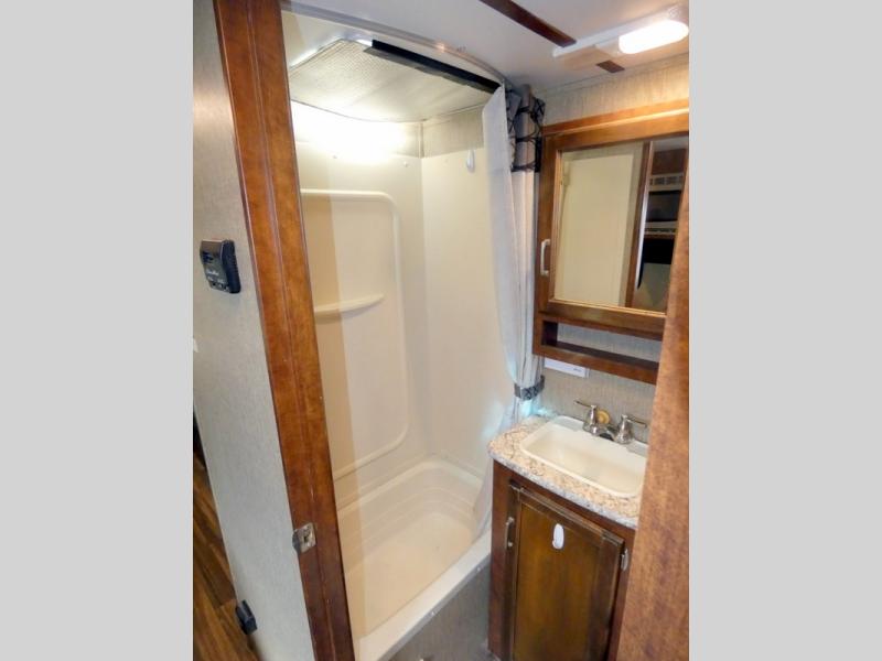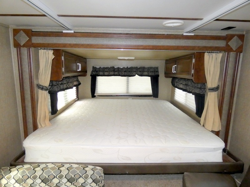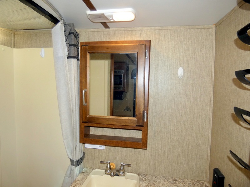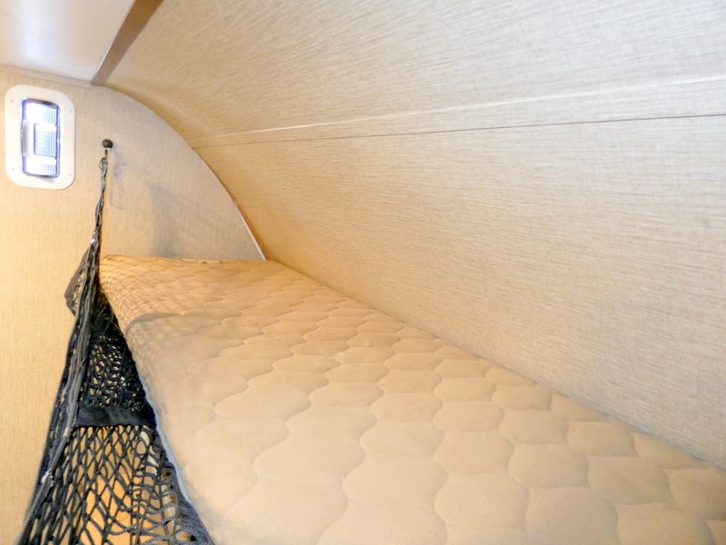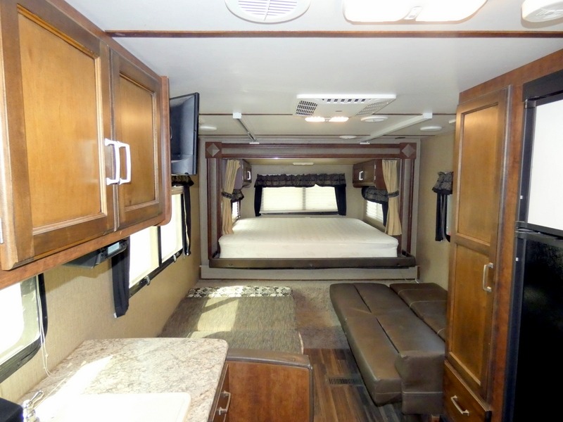In the rear the king bed slides out for a bit more floor space inside the trailer. Along the sides of the bed there is overhead storage which helps to keep your things neat and organized.