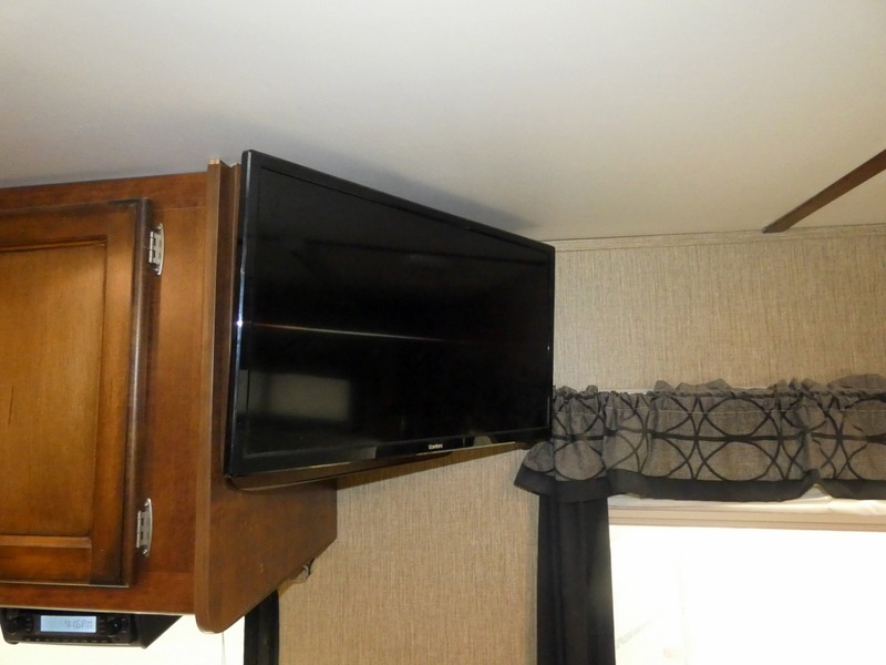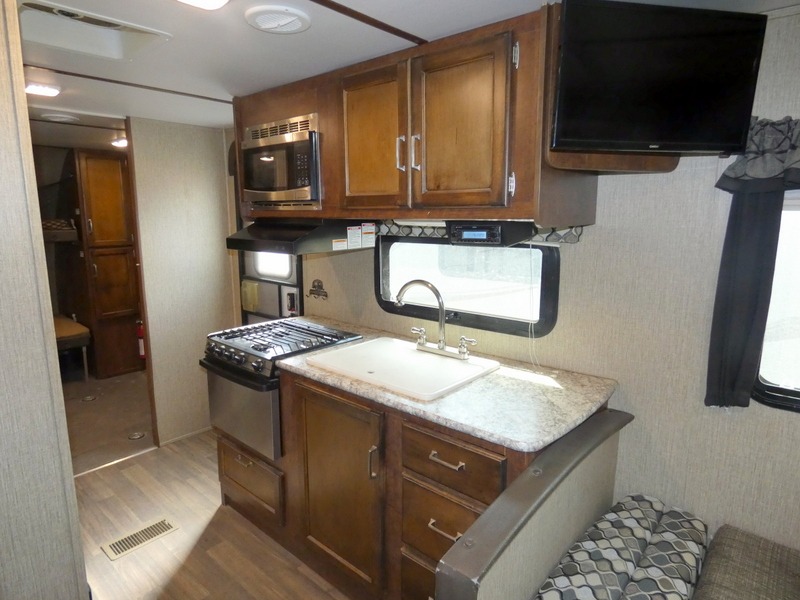 The kitchen area has everything you need to prepare meals and snacks. Next to the entry door there is a three burner range, large sink, LCD TV, and overhead cabinets for dishes and things. Across from the sink you will find a refrigerator and a pantry for your food storage needs.