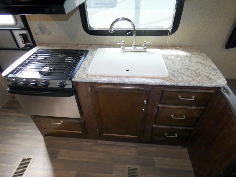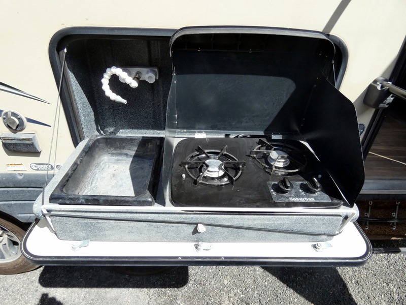 Outside you will find a camp kitchen with a two burner cooktop and sink. There is also exterior storage for your outdoor camping gear, and much more!