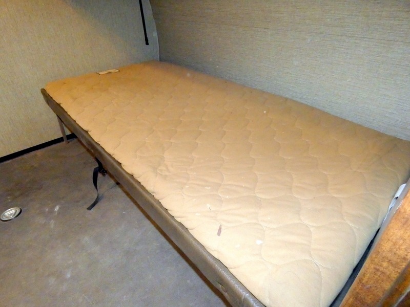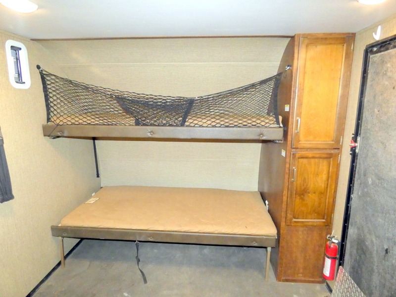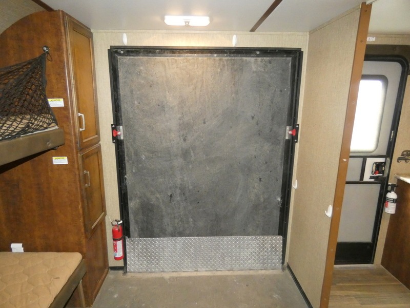 As you enter this model, to your right there is a private front garage with a set of flip down bunk beds, a wardrobe, and TV shelf. The 56" side ramp door allows for easy access to load and unload your toys and gear.