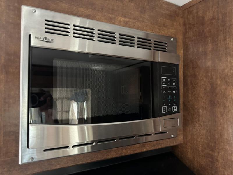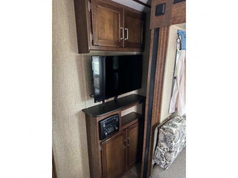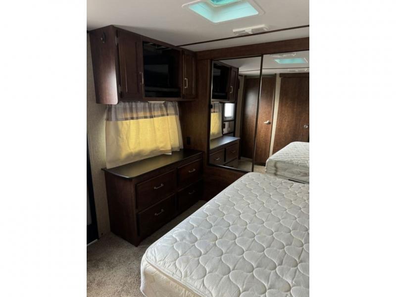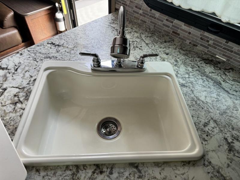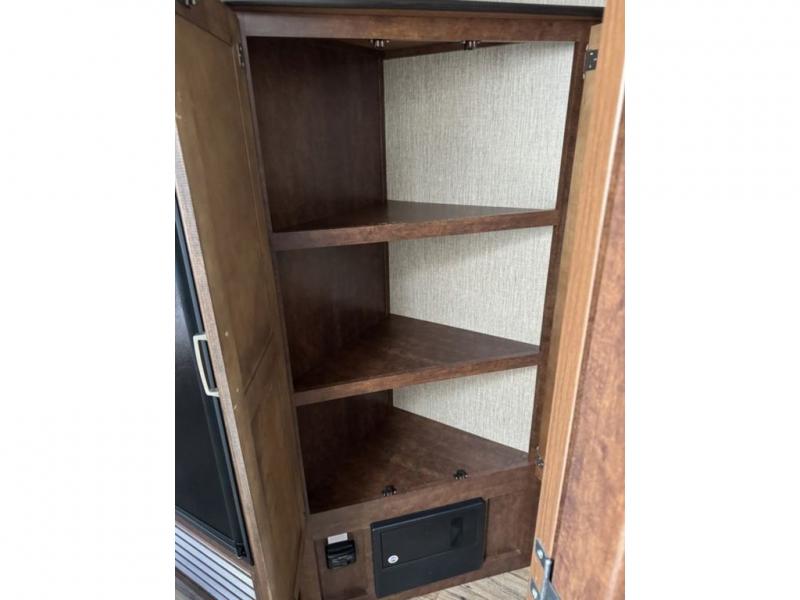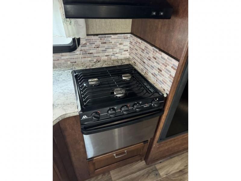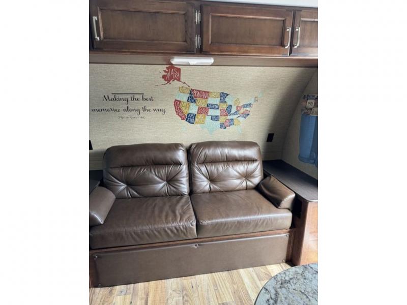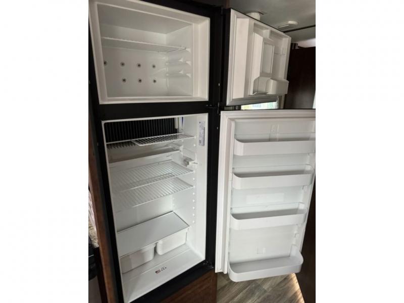 As you enter the main entrance you will find a sofa sleeper with dual wardrobes along the front wall. The kitchen amenities can be found along the curb side wall. There is a large kitchen sink, three burner range, refrigerator, and pantry/linen storage for making meals and snacks.