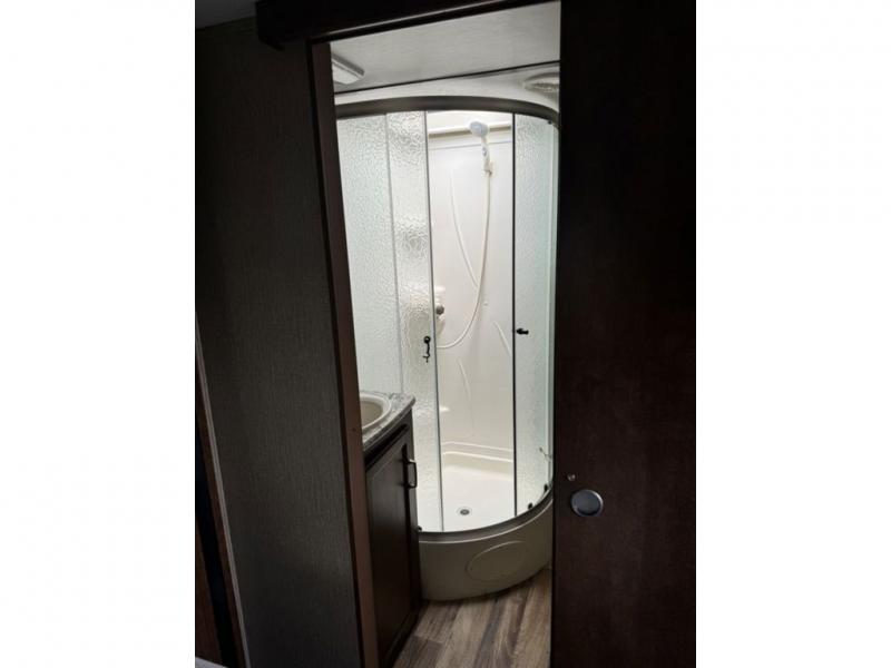 The bath is between the living area and rear bedroom. There is a radius shower, toilet, and sink. Plus you will find a second entrance door from the bedroom.