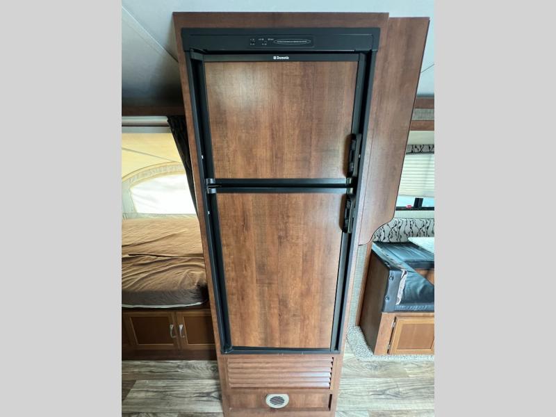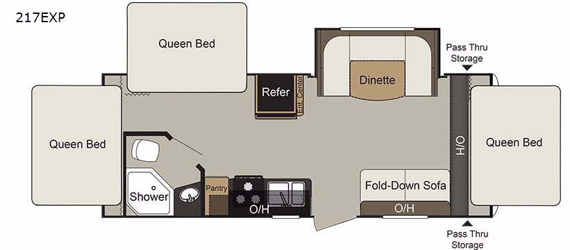 Enter and find a open living space with a fold-down sofa to your immediate right. Opposite enjoy the space created by a slide out u-dinette. There is an overhead storage shelf across the entire front of the unit before accessing the front queen tent end bunk. You will also like the entertainment center adjacent to the dinette slide for easy viewing from anywhere in the front seating and sleeping area.