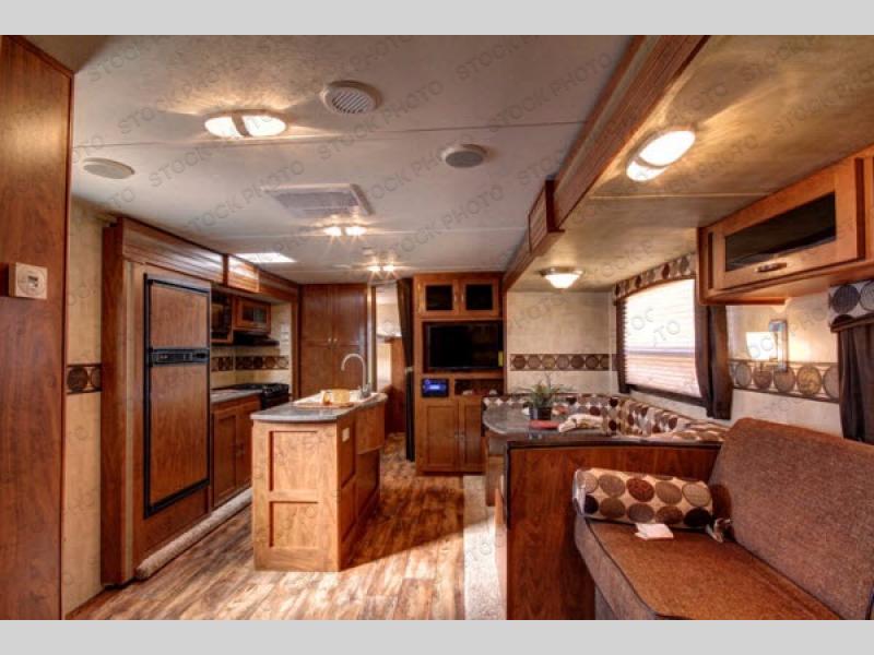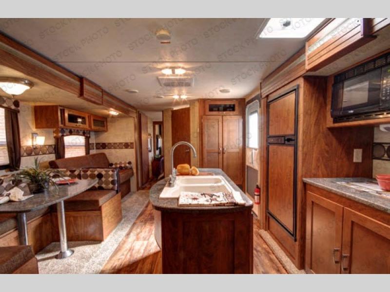 As you enter to your right is a handy closet. To your left is the kitchen that provides everything you need to prepare and provide meals for your family and guests. There is a slide out refrigerator, counter space, overhead cabinets, and three burner range. A pantry is next to the slide for easy storage of your dry goods and cooking ingredients. The kitchen island includes a double sink for easy cleanup. You also have the luxury of an outside kitchen too. This is located beneath the bunk beds on the curbside. The outside kitchen offers a refrigerator, counter top for prep space, and a single pull-out sink and two burner stove top.