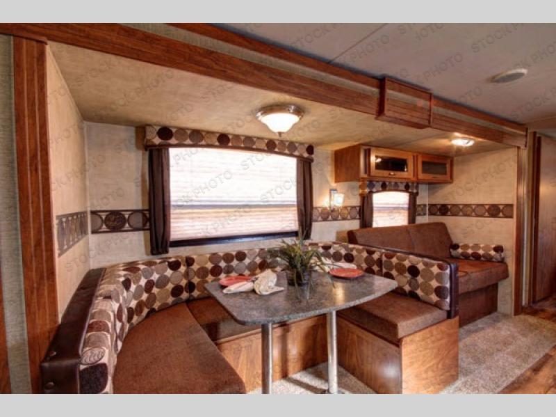 The living area features a large slide out fold-down sofa with overhead cabinets, and u-shaped dinette for meal time or hanging out. Both can be made quickly into additional sleeping space at night. The entertainment center is conveniently located on the interior half wall next to the dinette.