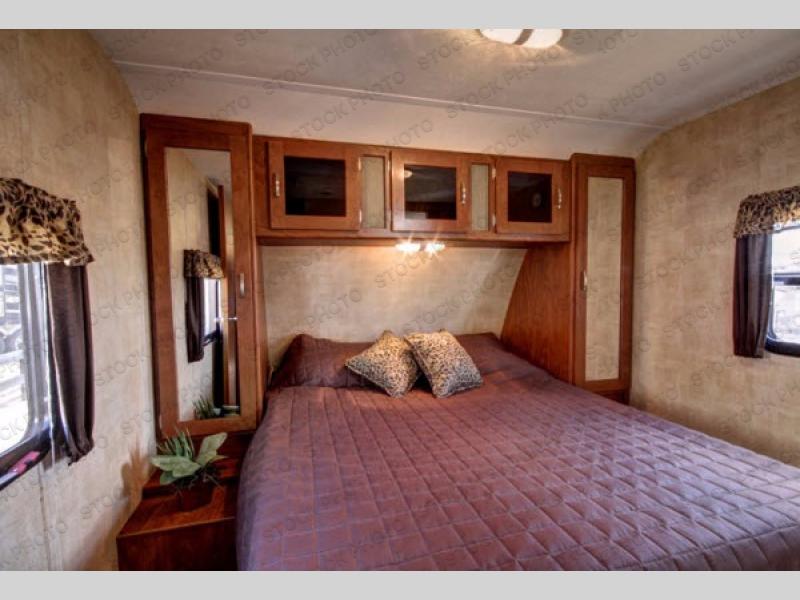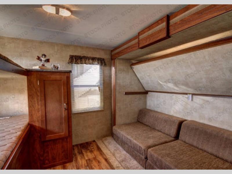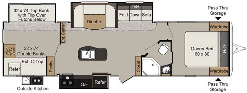 The rear bunkhouse will be a favorite hang out for the kids. There is a slide out 32" x 74" top bunk with flip-over futons below on the right. On the left side find 32" x 74" set of bunks, and a wardrobe with TV shelf on the rear wall.