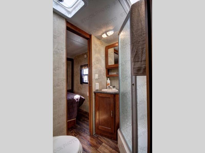 The bath is next to the front bedroom. There is corner shower, sink, toilet, and second entrance into the bedroom. The front bedroom features a queen size bed, dual wardrobes for clothing, plus overhead storage.