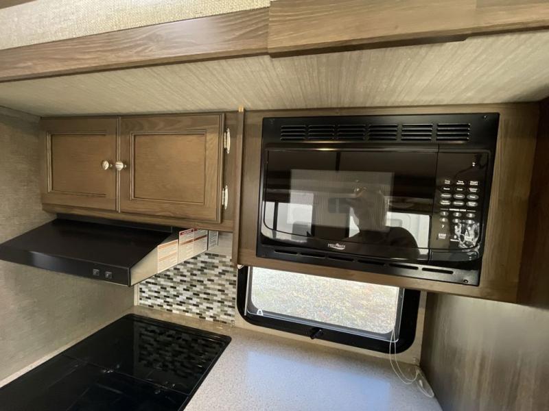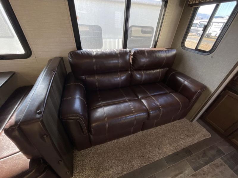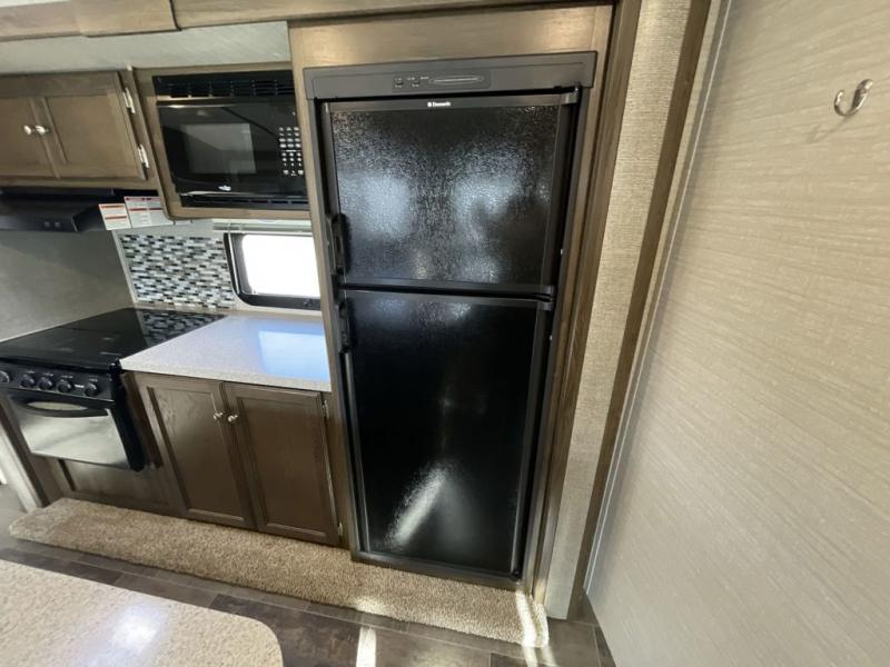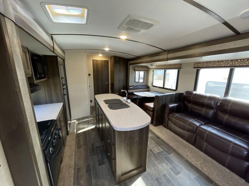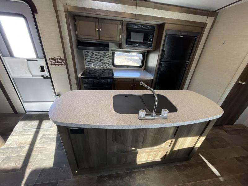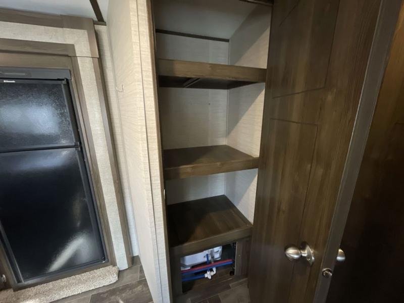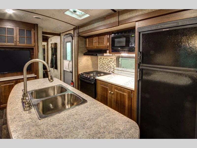As you enter you will notice how open this unit feels with the combined kitchen and living space including two slides opposite one another. To the left of the entrance there is a slide out three burner range, counter area with overhead cabinet, and refrigerator. A large pantry off to the side provides ample space for storing dry goods and more. There is also a convenient kitchen island with added counter space and a double sink that will make cleanup a cinch.