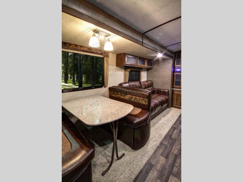 The opposite side features a tri-fold sofa and booth dinette. Both can be made into extra sleeping space at night and the sofa features overhead cabinets for storage. There is also an entertainment center on the interior wall that can be easily viewed from any seating in the room. A second smaller pantry is located off to the side of the dinette slide.