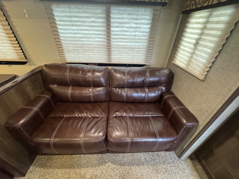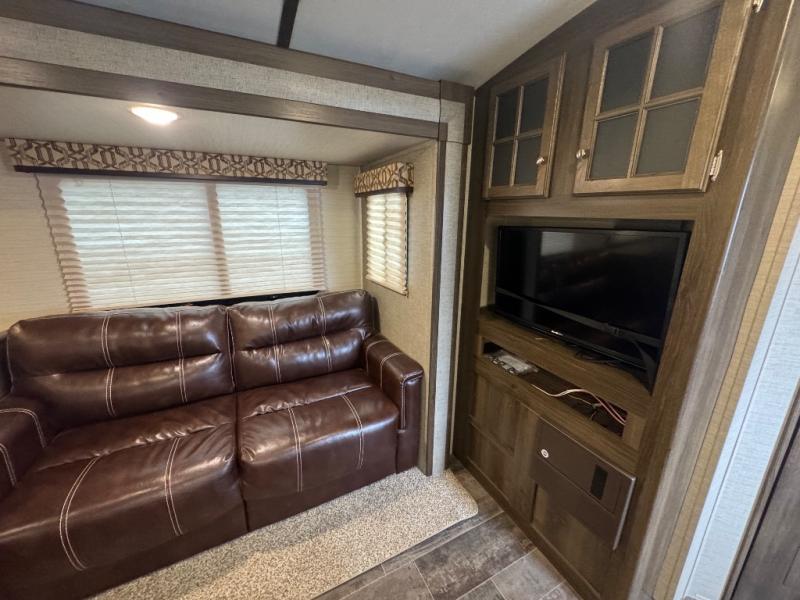 In the main living area enjoy the added space thanks to a large slide out. To the left of the entry door there are two lounge chairs with overhead cabinets that stretch all the way to the rear of the unit and around the corner in the kitchen area. Opposite in the slide out find a tri-fold sofa and booth dinette. The perfect spot for enjoying your meals, or just hanging out. A nearby entertainment center is perfect for viewing from any seating space.