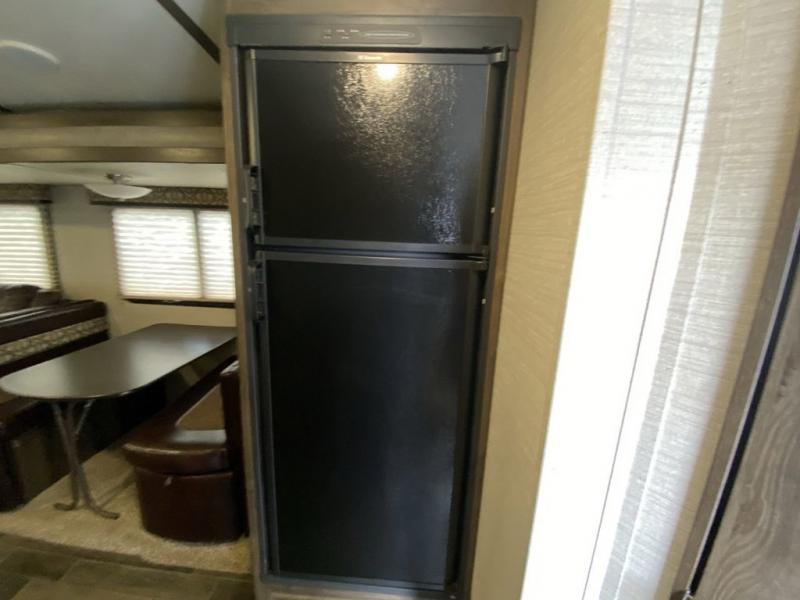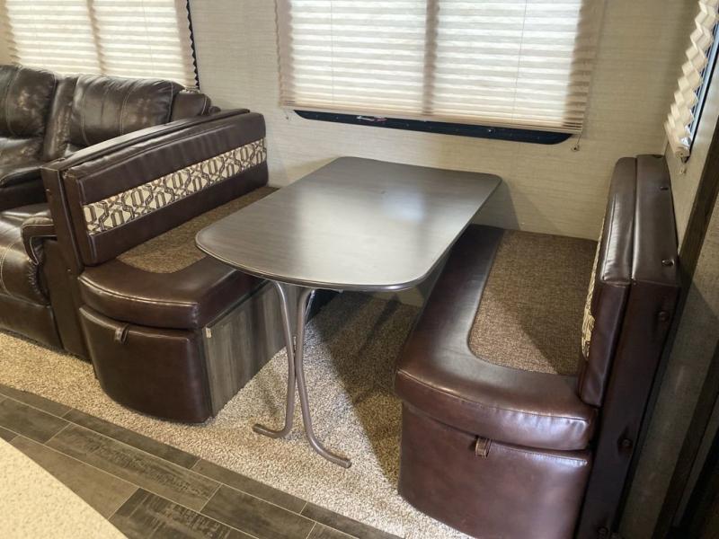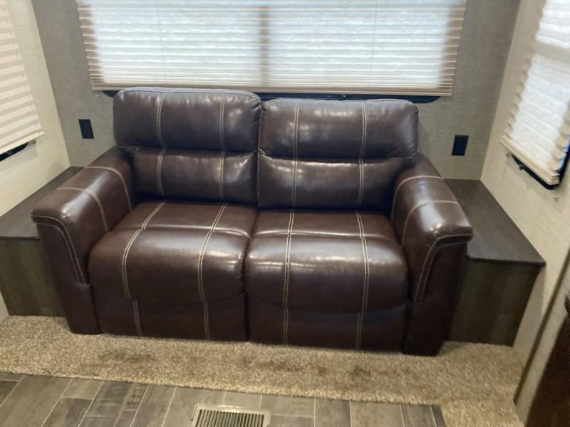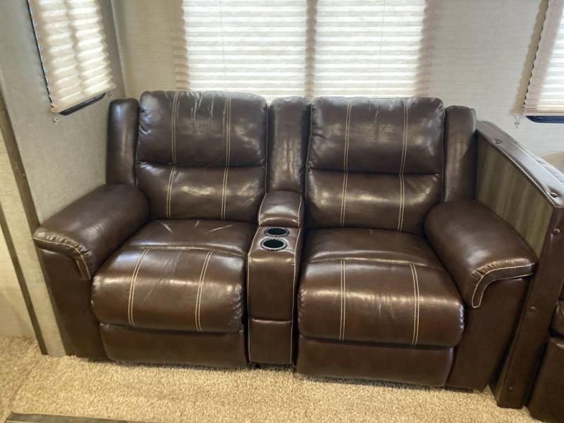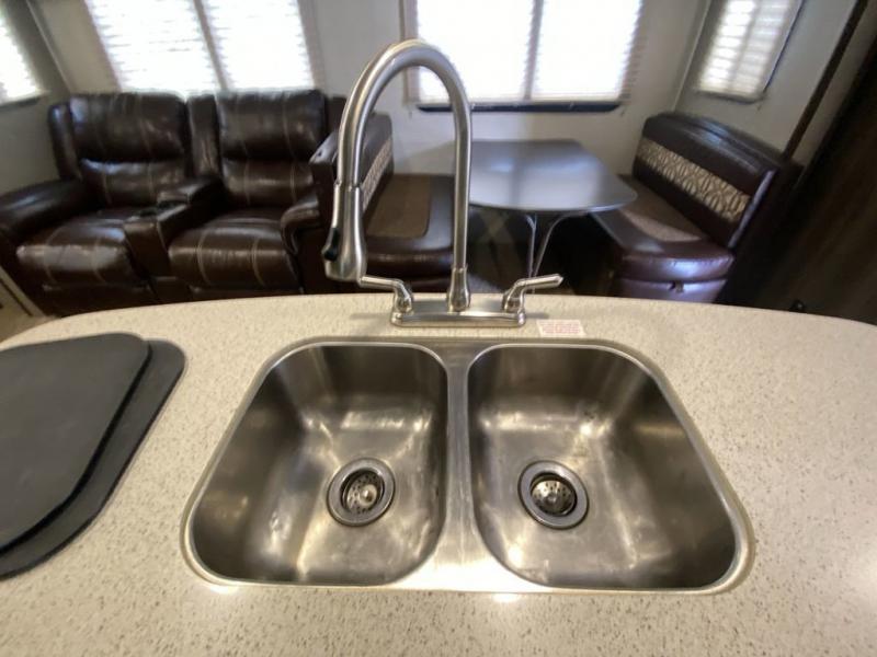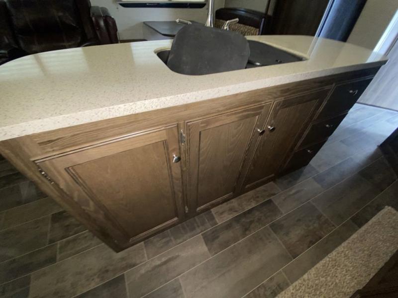 On the road side, you will find luxury cinema recliners for two, and a booth dinette slide. The refrigerator is located just off the slide near the booth dinette. There is also a convenient island in the middle that features a double kitchen sink for clean up and extra counter space for prep work.