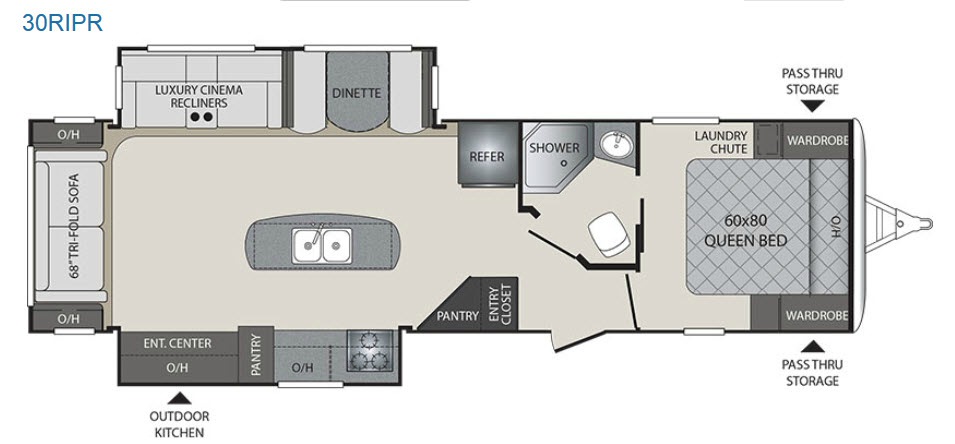 Step inside this Premier Ultra Lite travel trailer 30RIPR by Keystone RV. It features a rear living layout, double slides, luxury cinema recliners, and a convenient kitchen island.