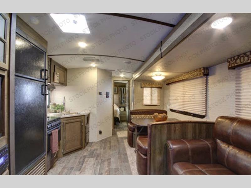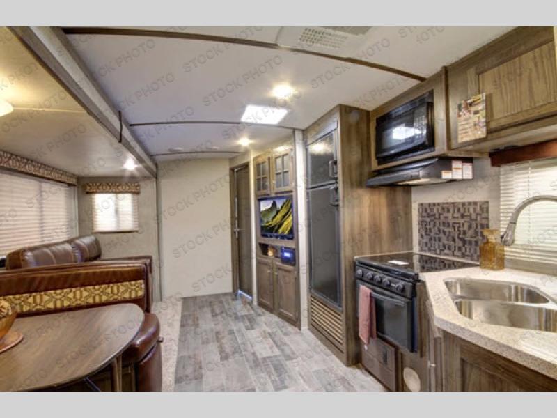 Along the exterior you will find an outdoor kitchen with a refrigerator, sink, overhead storage, and a two burner cooktop for the outdoor chef in the family. Plus the handy pass-through storage compartment provides added space for your gear.