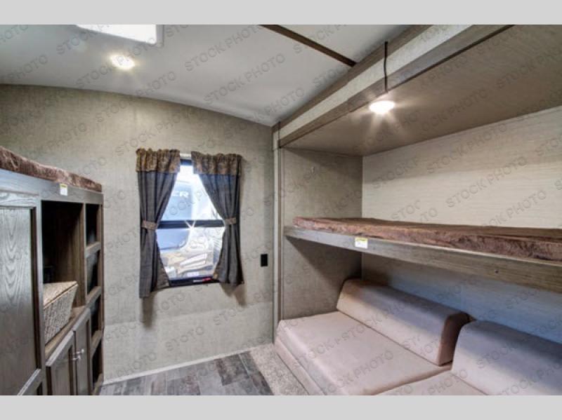 The rear bunkhouse includes a walk-in closet/pantry, a slide out including futons below a flip over bunk along the road side wall, and a bunk above a wardrobe and a ladder on the opposite side. The kids or guests are sure to love their private space.