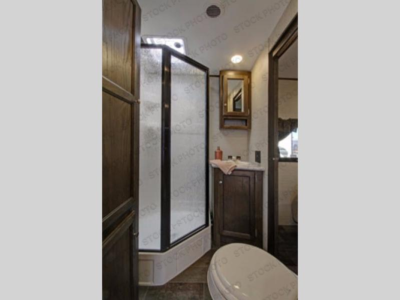 As you enter the travel trailer, straight ahead you will find the main entrance to the bathroom. There is an angled shower, sink, toilet, and linen storage. A second entrance from the front bedroom provides an added convenience.