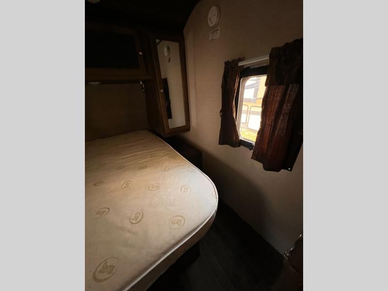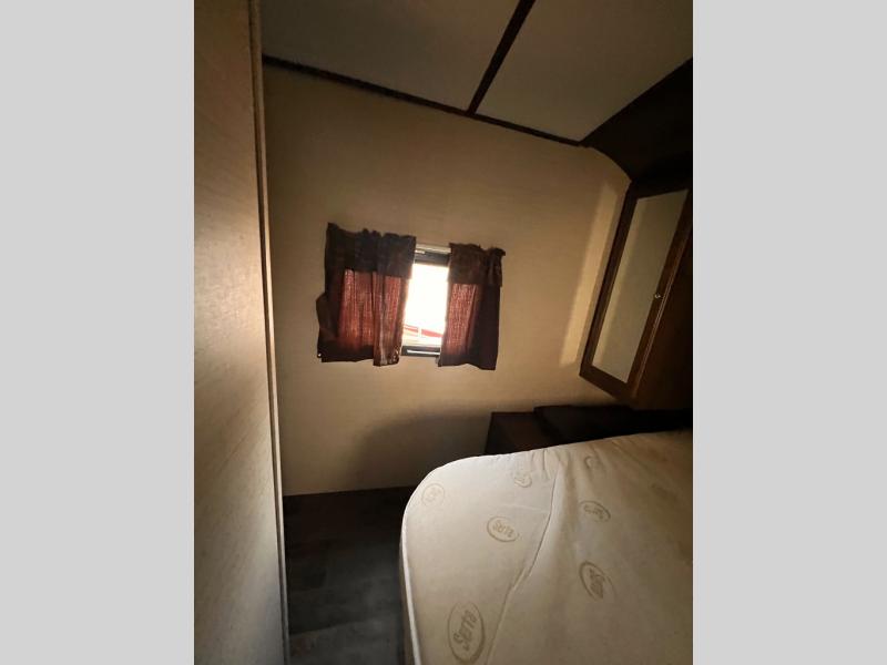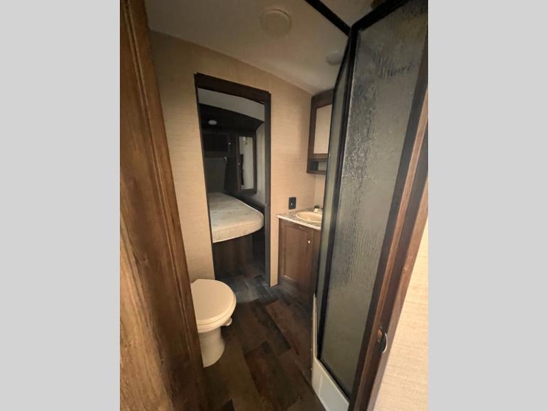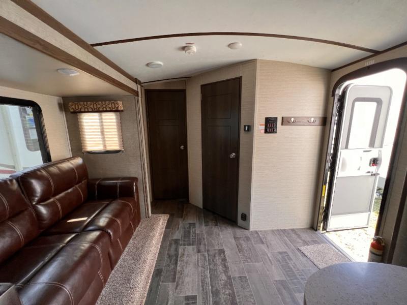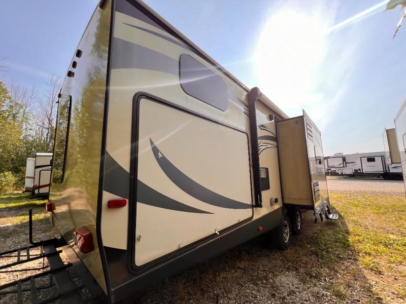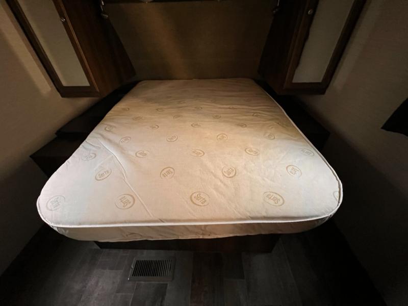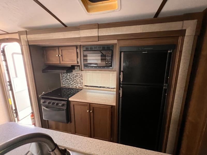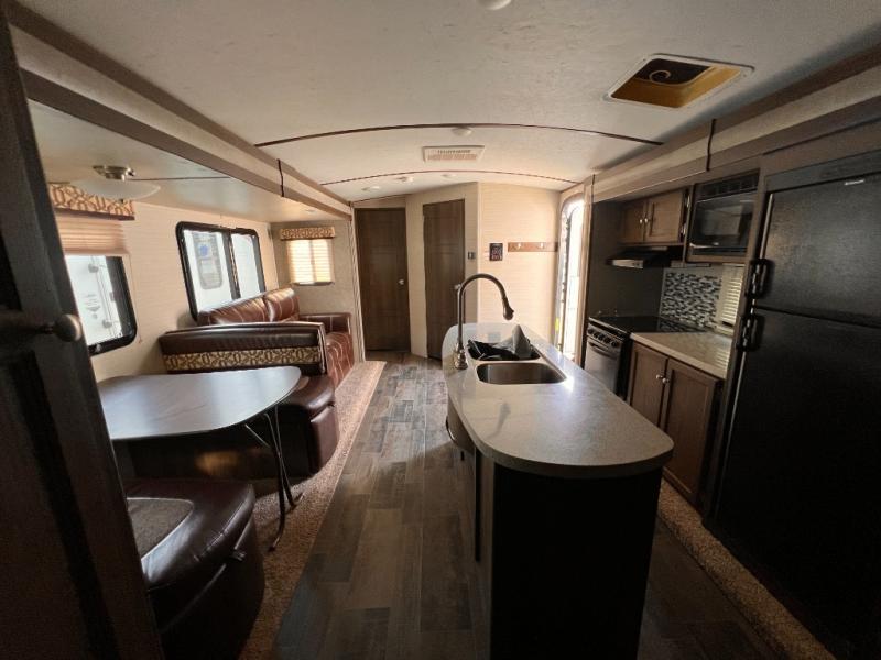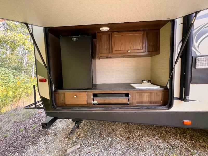 There is a pass-through storage compartment in the front for all of your exterior camping gear. There is also an outdoor kitchen that includes a two burner cooktop, a refrigerator, sink, and storage space, plus so much more!